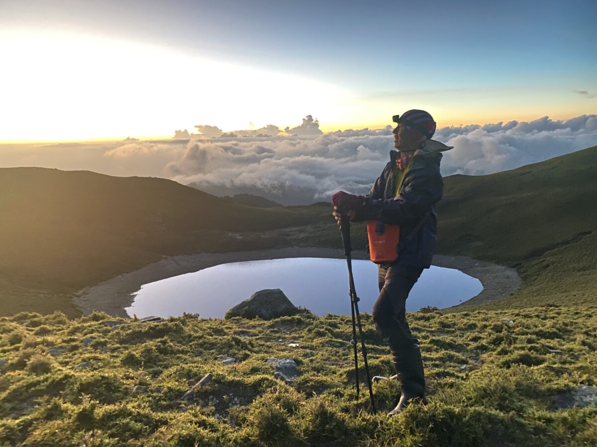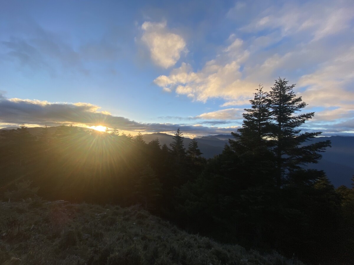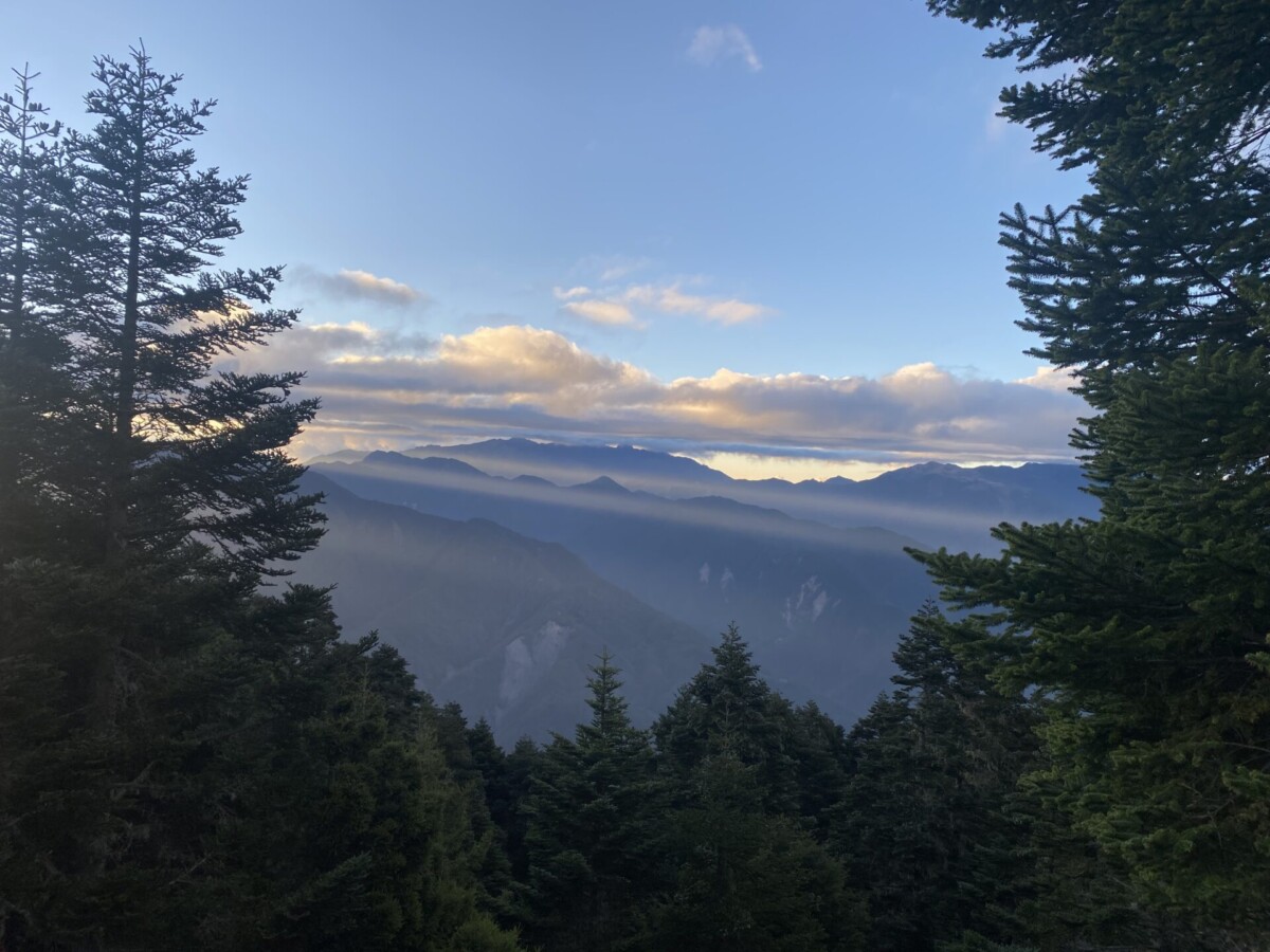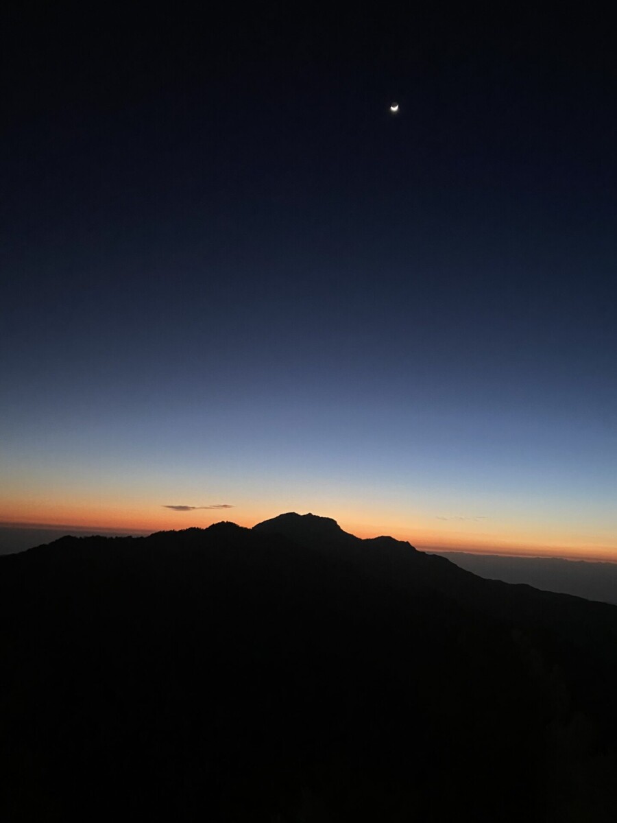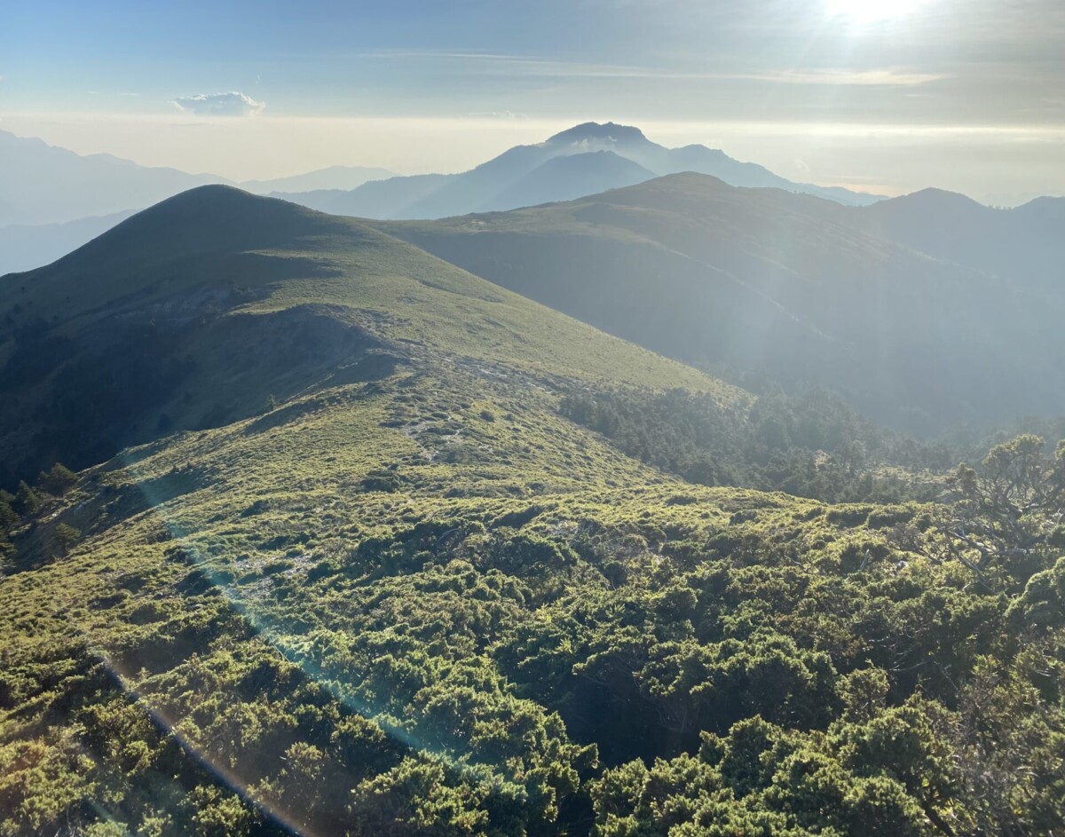 景色:嘉明湖看日出,在往布新營地前的箭竹地可以明顯看到玉山山脈和馬博橫斷的山脈,很壯美。