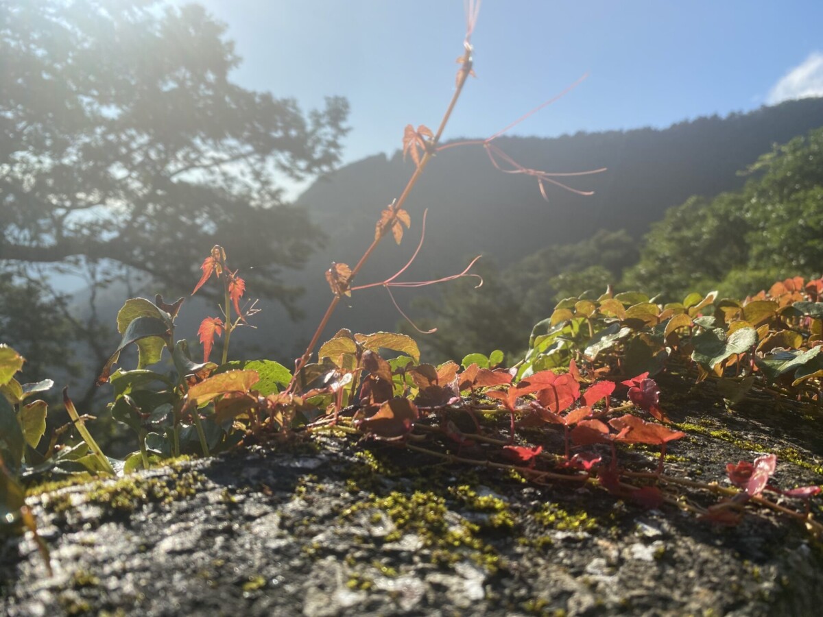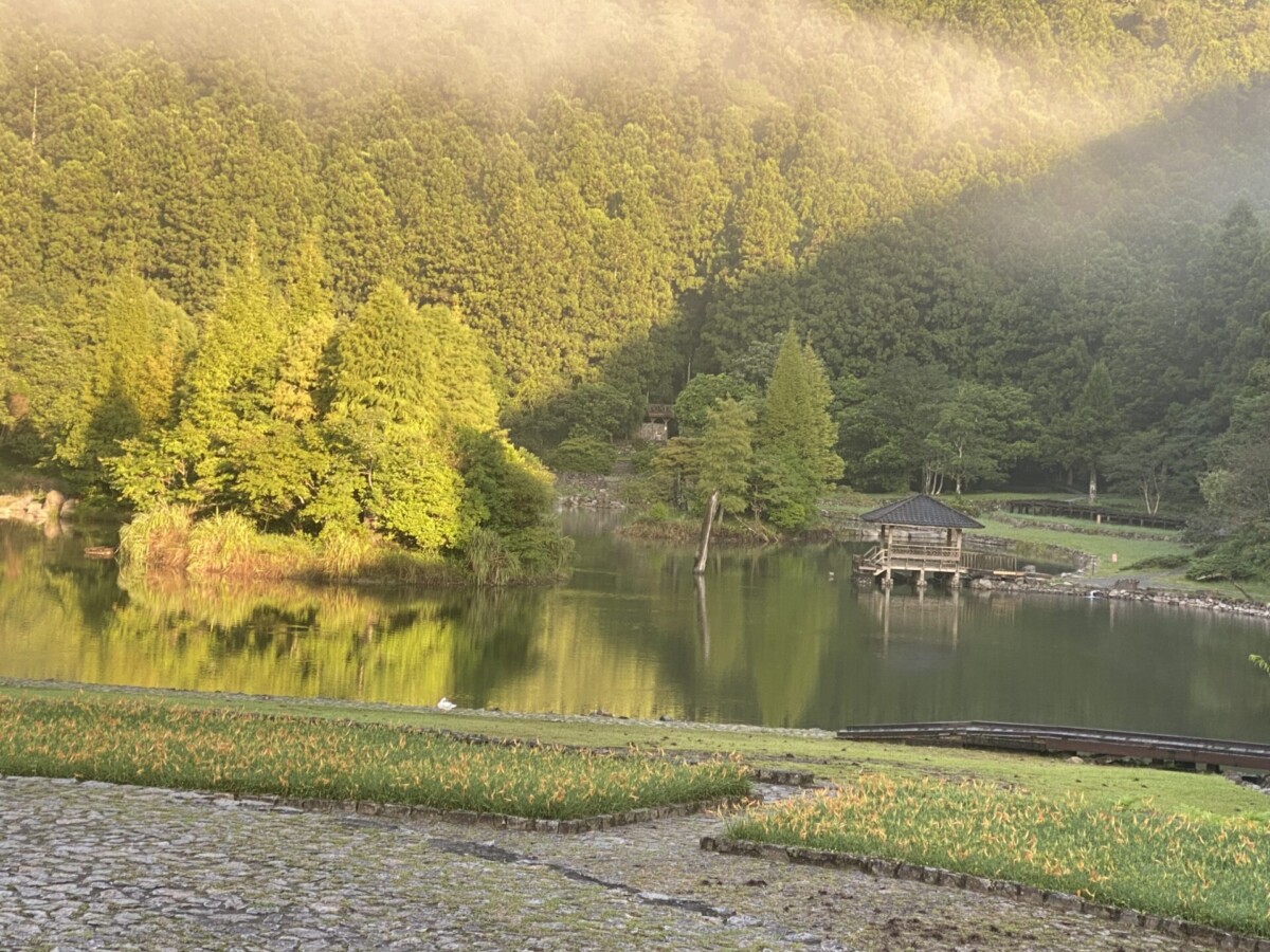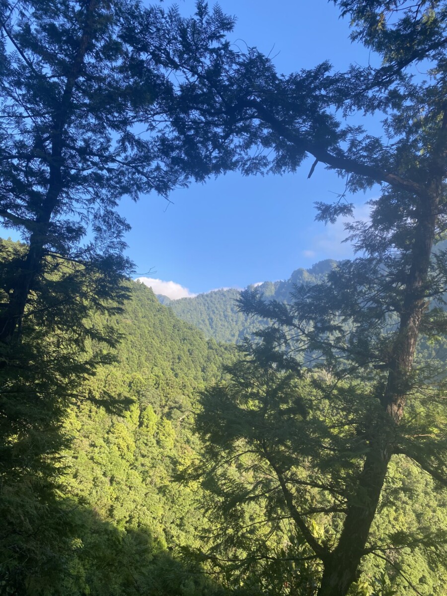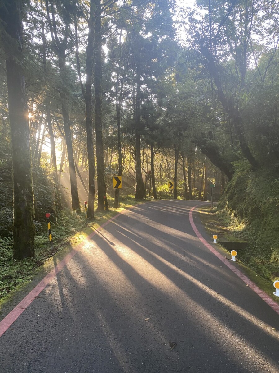 因為這個改變,隔天早上可以睡到5點(本來是5點出發的),從從容容吃完早餐,散步往芃芃山的登山口。沿路朝陽從杉木林的縫隙射下來的光線,透過空氣裏水氣的反射,我都要大叫哈利路亞了!