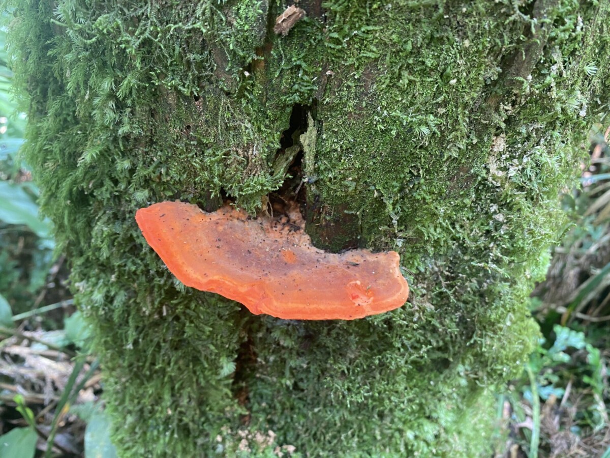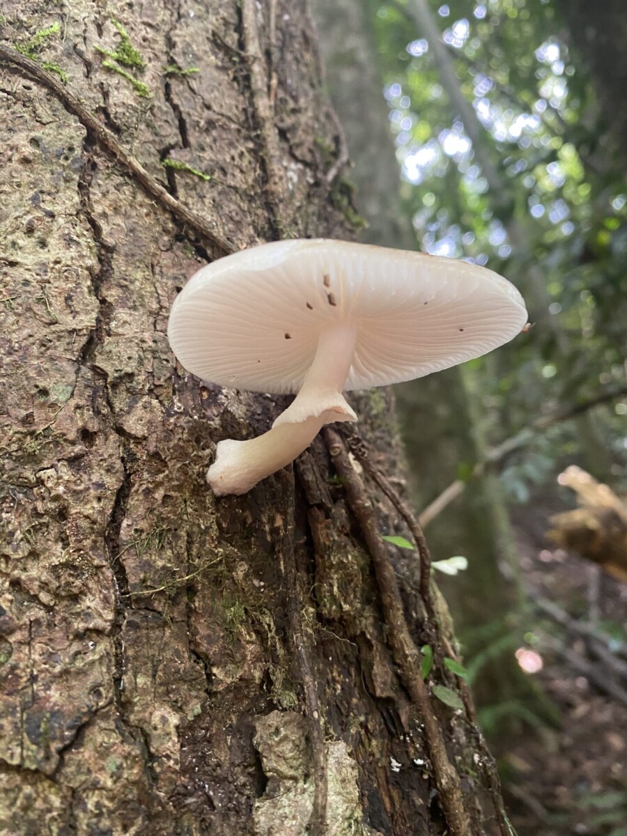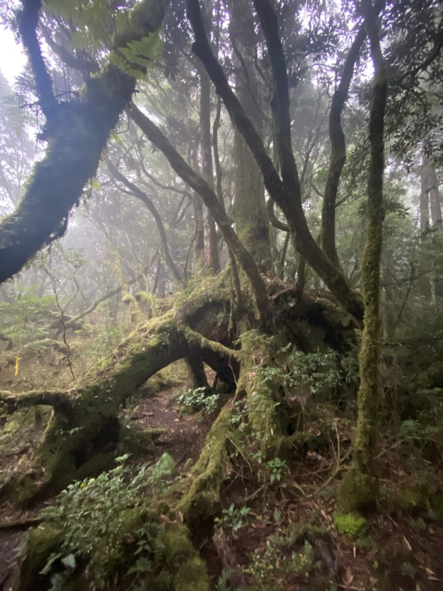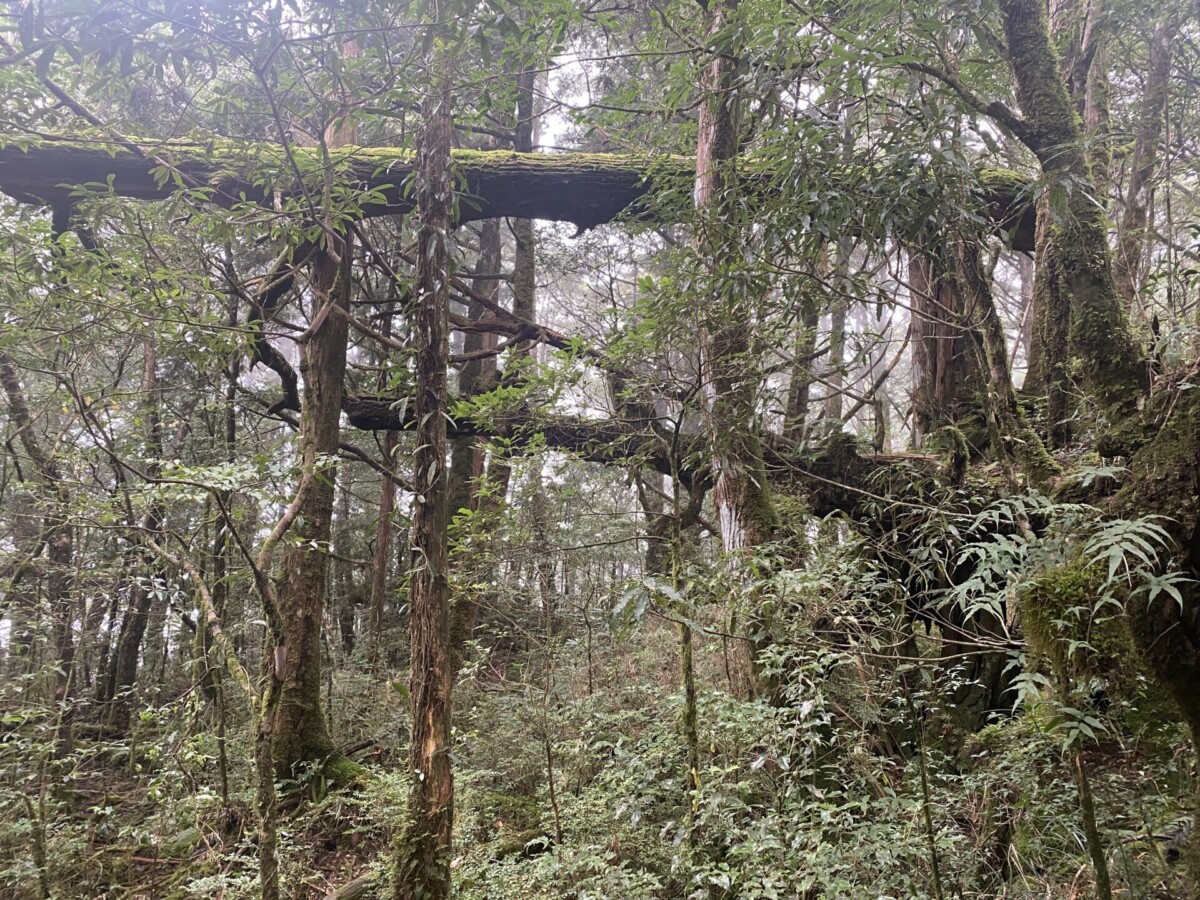 我又想到在攀上復興尖山前碰到的那一場大雨,樹冠hold不住了往樹幹流,樹幹hold不住了就像小瀑布般往地上直接奔瀉。我知道那些樹是認真在蒐集雨的,然後讓它們流往根處,那麼泥土裏的根和好朋友真菌也會幫忙吸收起來,往上送到樹冠,再蒸散為雲霧,然後在午後再回收為雨水,成就一個良善的循環。在那個當下,太感動了,我不禁伸出雙手去接,第一次嚐到了台灣森林新鮮的水。我想,大家既然已經相互交換了細菌,算是我中有你你中有我,是發自肺俯的真心好朋友了吧!