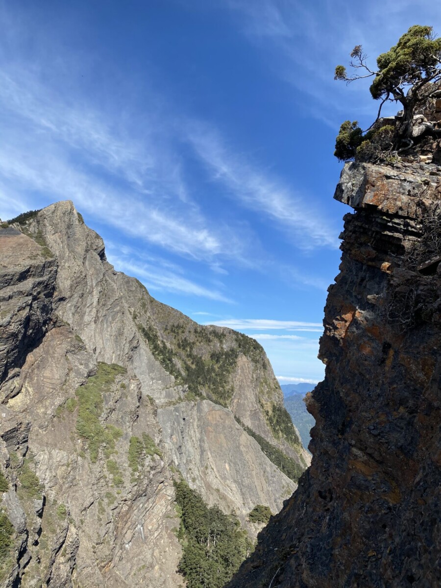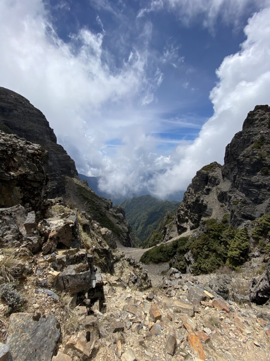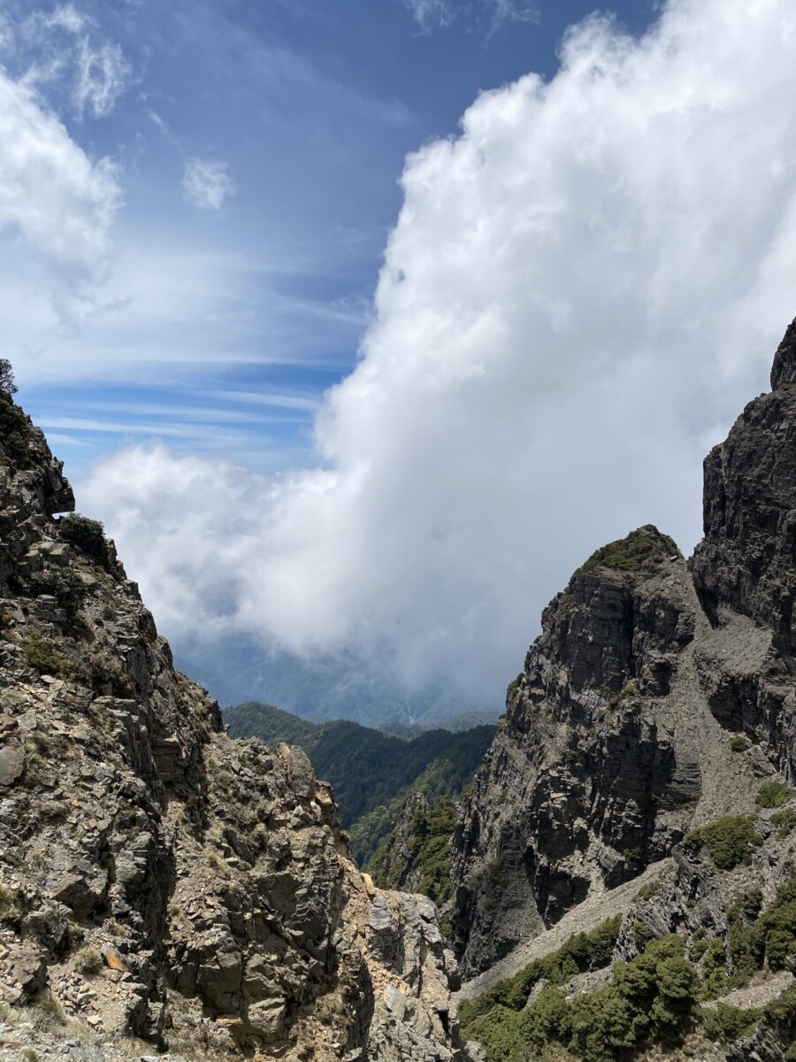 在抵素密達山屋之前的斷崖下,他說又想吐了,我就讓他自由休息。我不可能揹二個重裝背包爬斷崖,就接收了他認為比較重的睡袋。