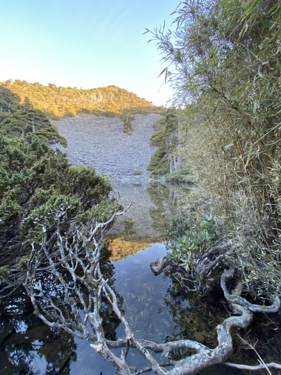因為速度實在太慢了,响導乾脆跑了上來,把年輕小子的背包揹下去。响導在鞍部,把年輕小子的背包固定在他自己的背包上,領著小隊繼續從鞍部走向下去翠池的大陡坡,年輕小子的高中同學、年輕小子走在小隊的後面,我很不放心就押在他們後面。