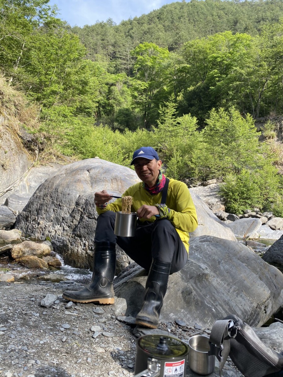 在三叉營地碰到一些從鈴鳴山經無明山來的年輕朋友,其中有位獨攀的妙齡女子,居然是取無明山上「天池」的髒水過濾煮沸來喝。因為水太髒,過濾膜有點塞住,必須耐心用力慢慢擠壓呢!