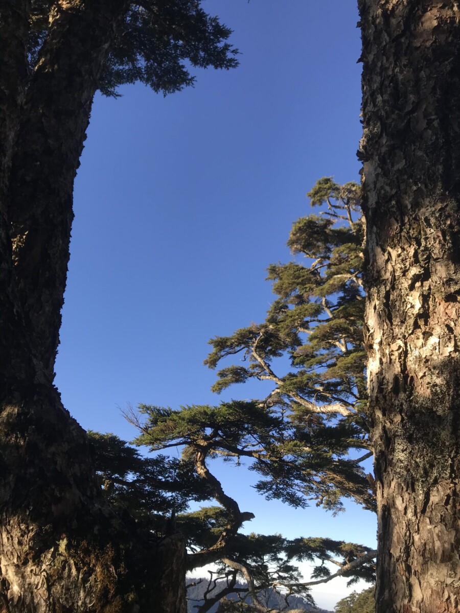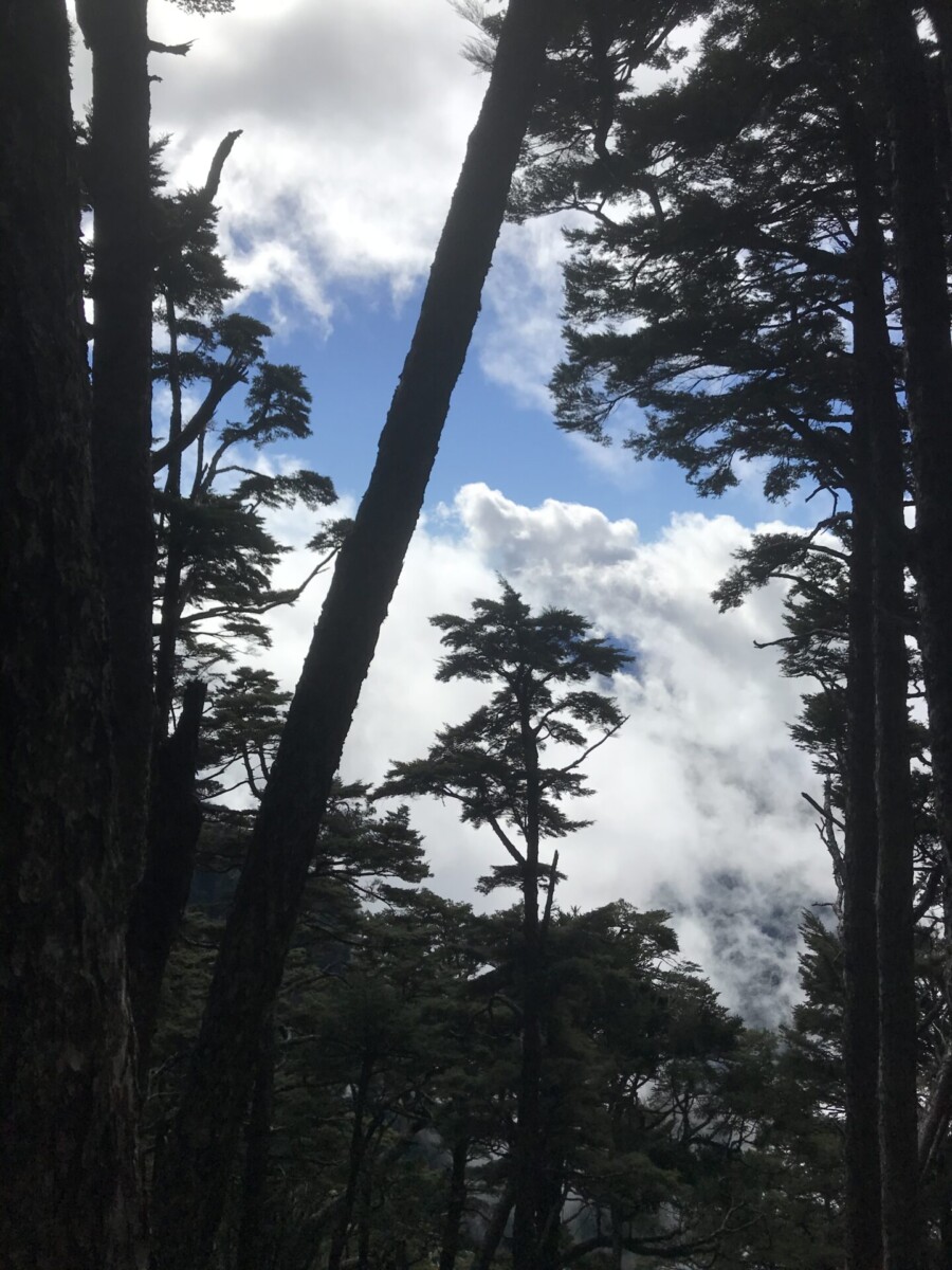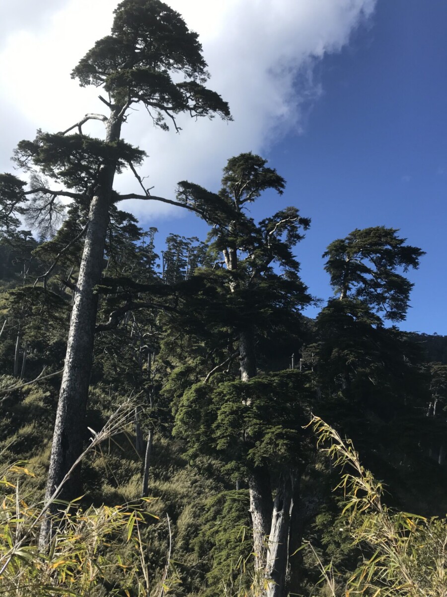 在海拔2,800-3,200之間的步道旁,群聚了高大的針葉林,樹幹筆直粗大,好像台灣雲杉(有山友說是台灣鐡杉,但是台灣鐵杉分枝較多。),十分高壯美麗。只要立在林下吹吹風,就是人生一大樂事。