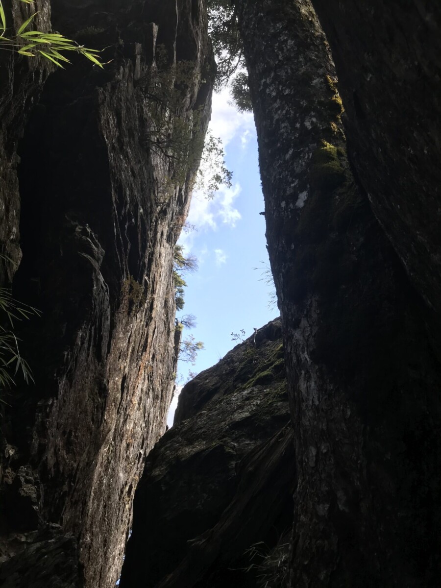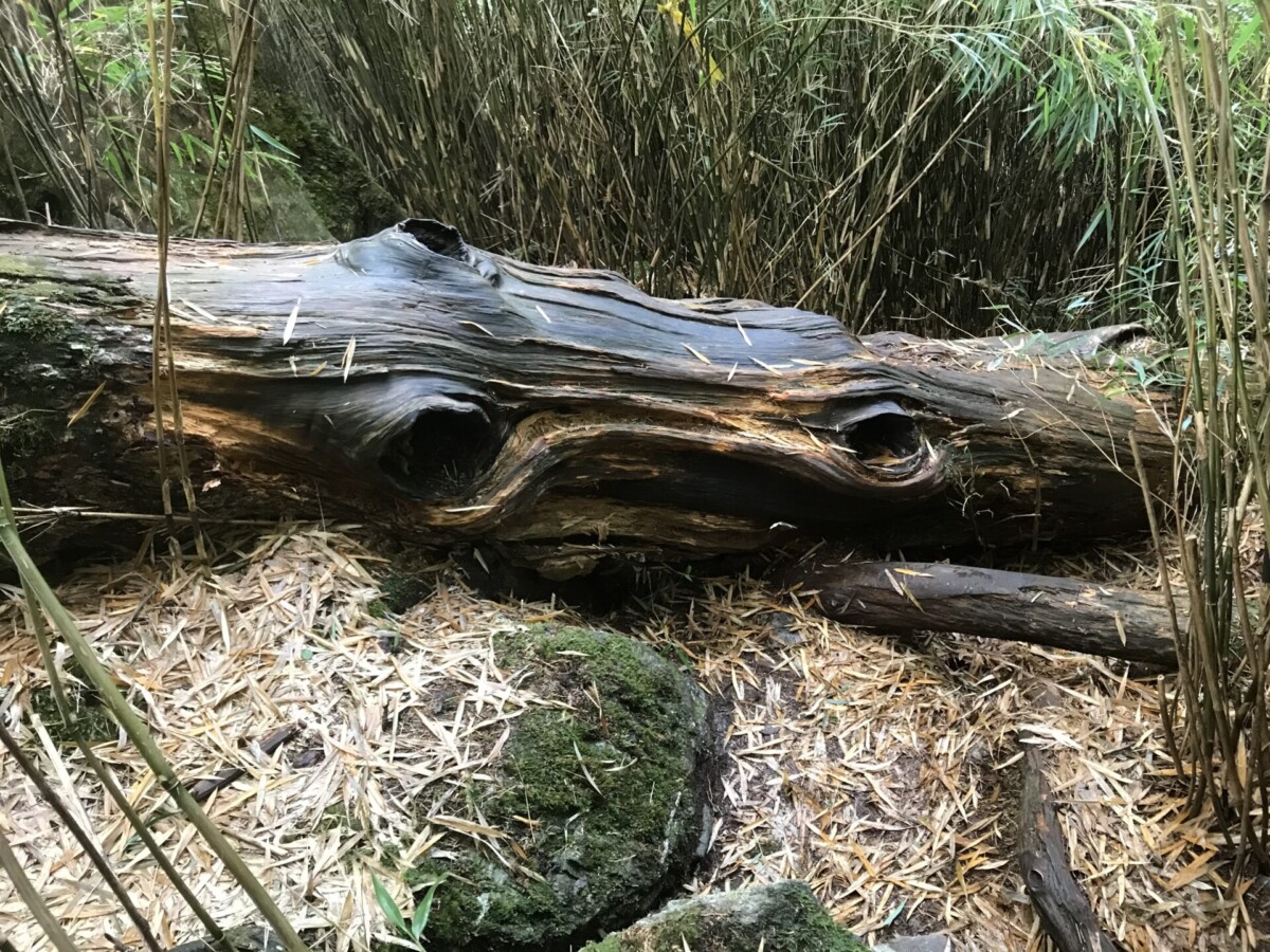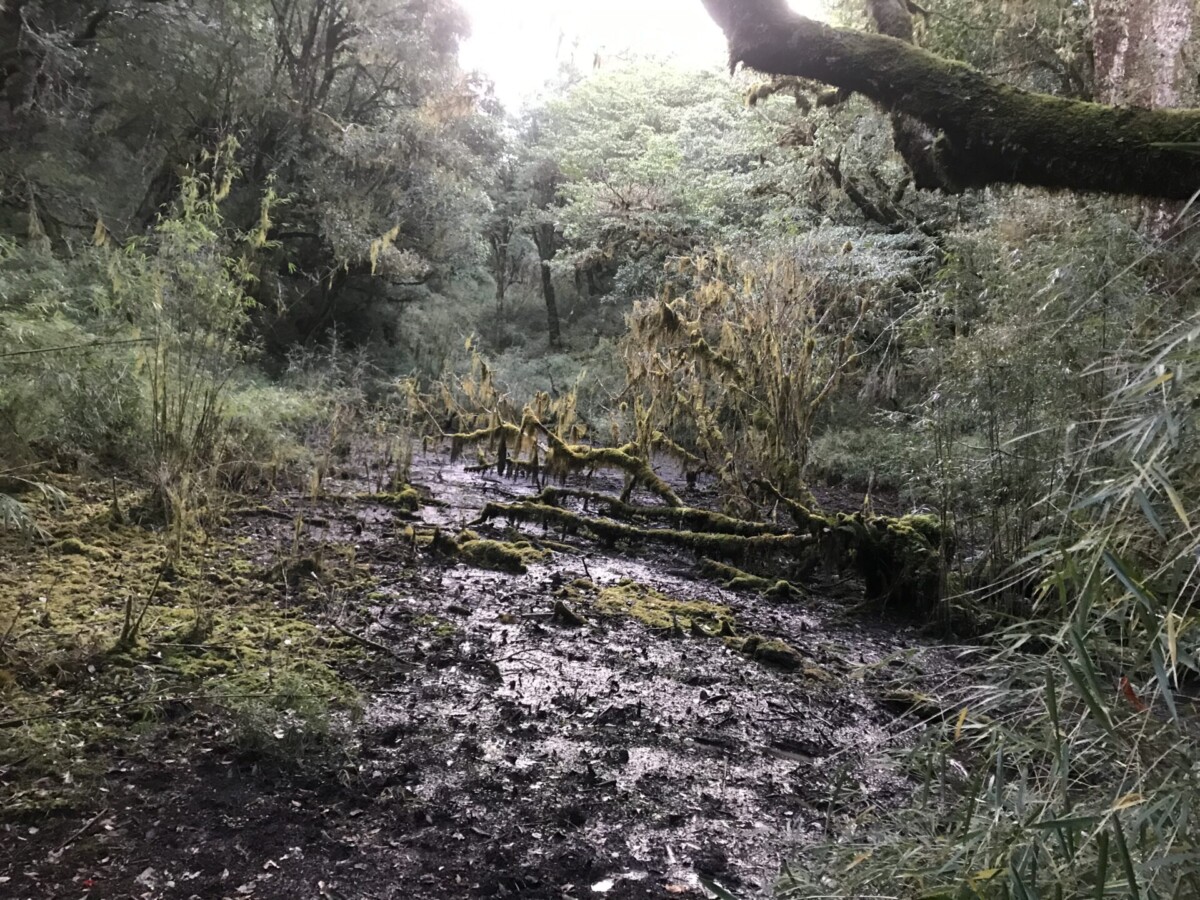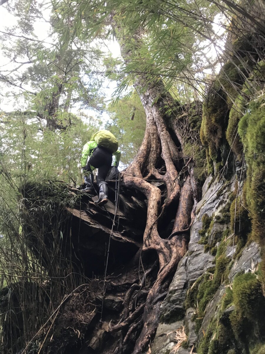 沿路的陡坡,裸露的樹根很滑。巨大的倒木不少,只要重心向它們貼近,其實並不難通過。箭竹林長得蠻高的,但穿越不免一身溼,所以一早起登,要及時穿上雨衣雨褲。