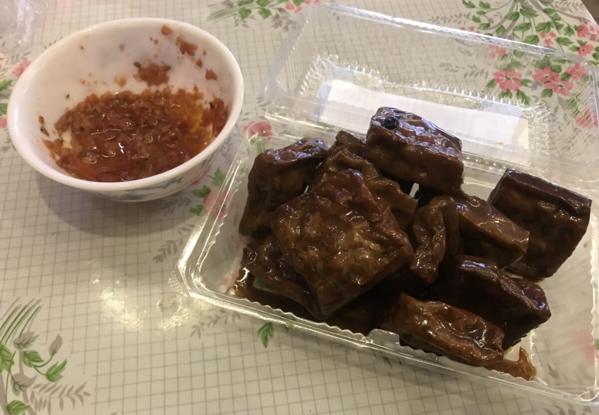 跟清安村東口的店,點了一份滷豆腐亁,充當早餐。有一隻黑色的小流浪狗,聞到了好味道,瘋狂地跑來搖著尾巴,並把前腳搭到了我大腿的雨褲上,急切想我餵它。