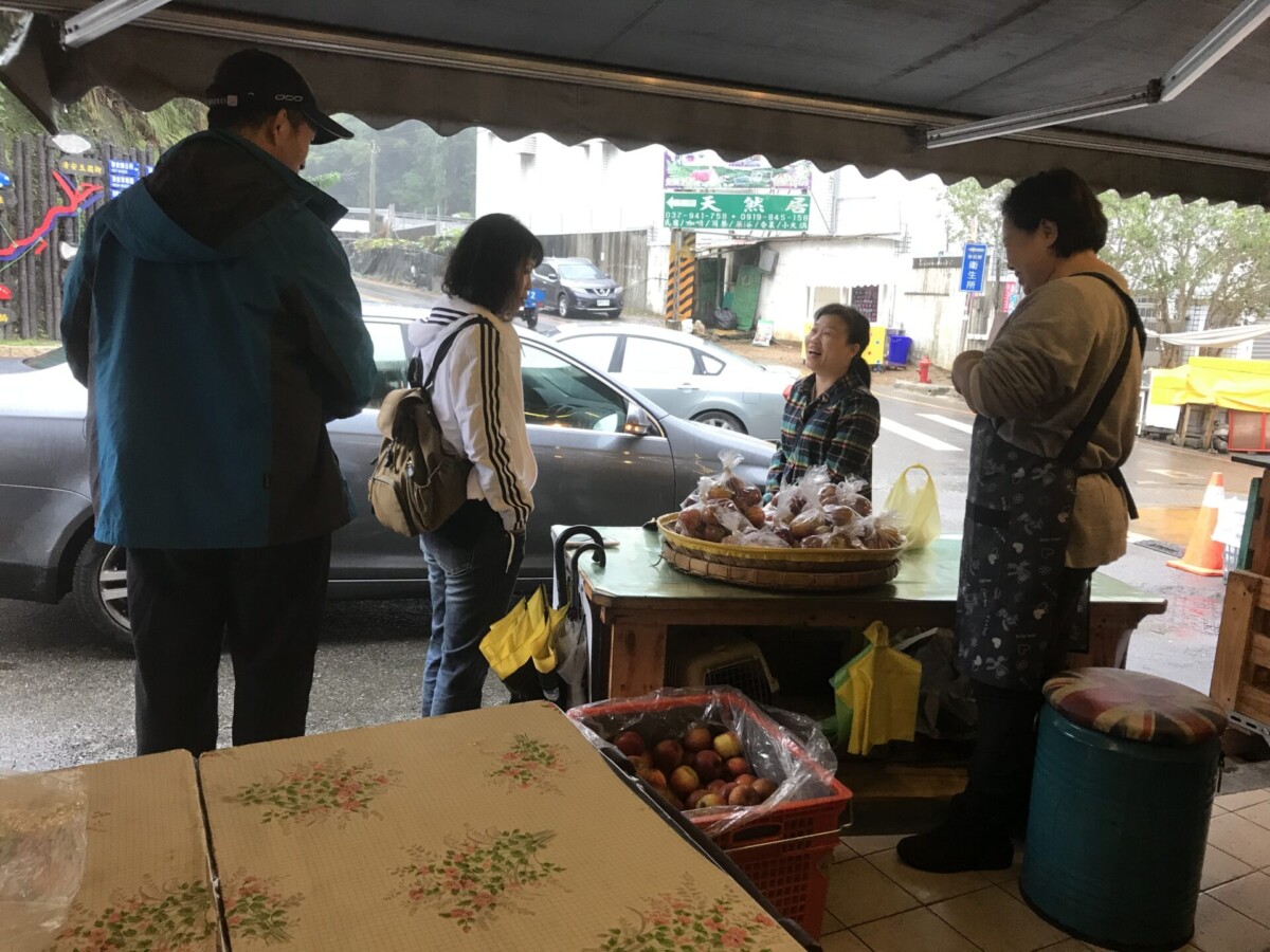 這時有一組從宜蘭來的遊客,停下車跟老闆娘買梨山蘋果。他們說宜蘭一直下雨,所以南下到苗栗想曬曬太陽,沒有想到昨天才出了一天的太陽,今天又下雨了。