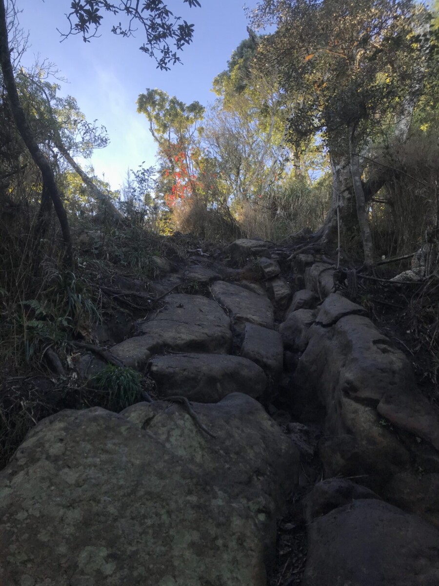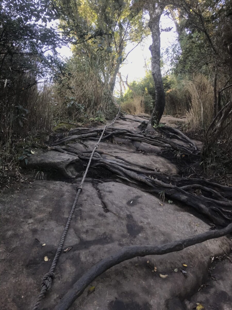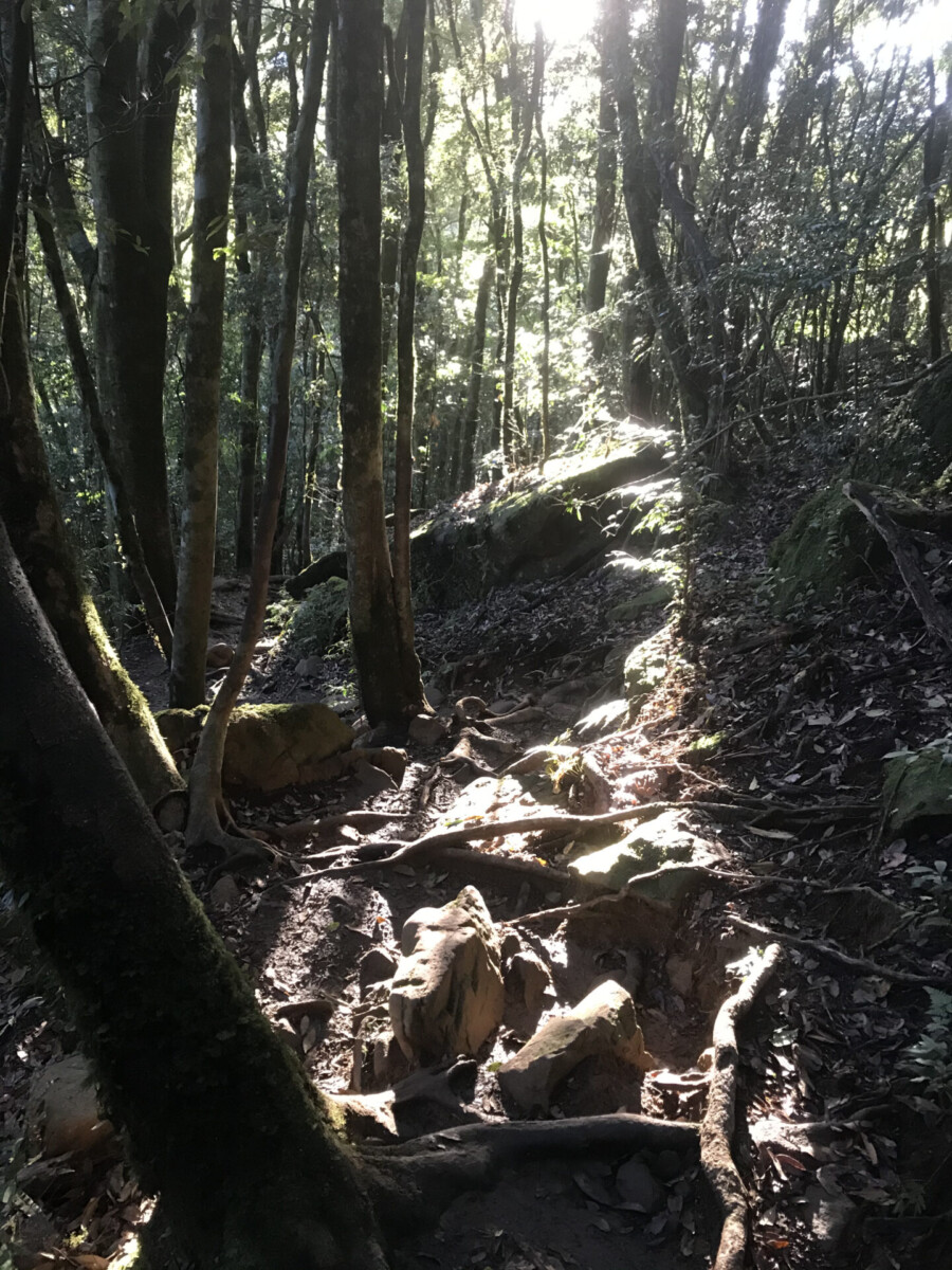 到了加里山三角點之後,接下來大部分的路就是往下,而且有很長的陡下,走到海拔約620公尺的島上,要下降1,580公尺,共7.5公里。下坡要注意安全,拼命剎車,走到都厭世了。