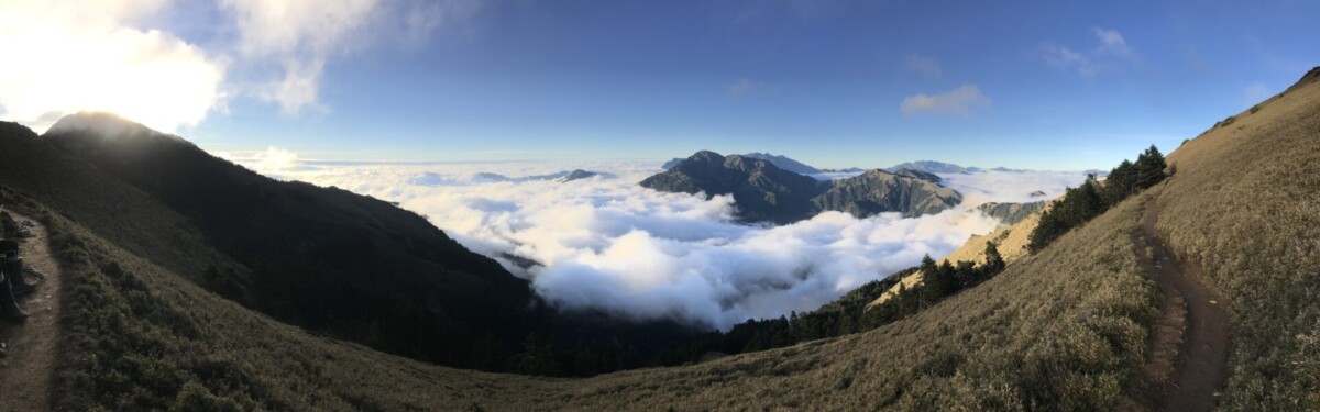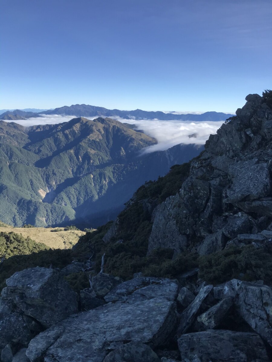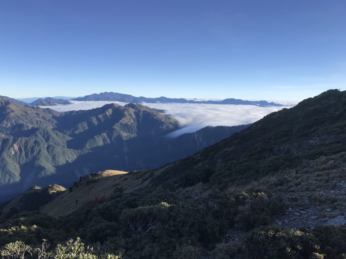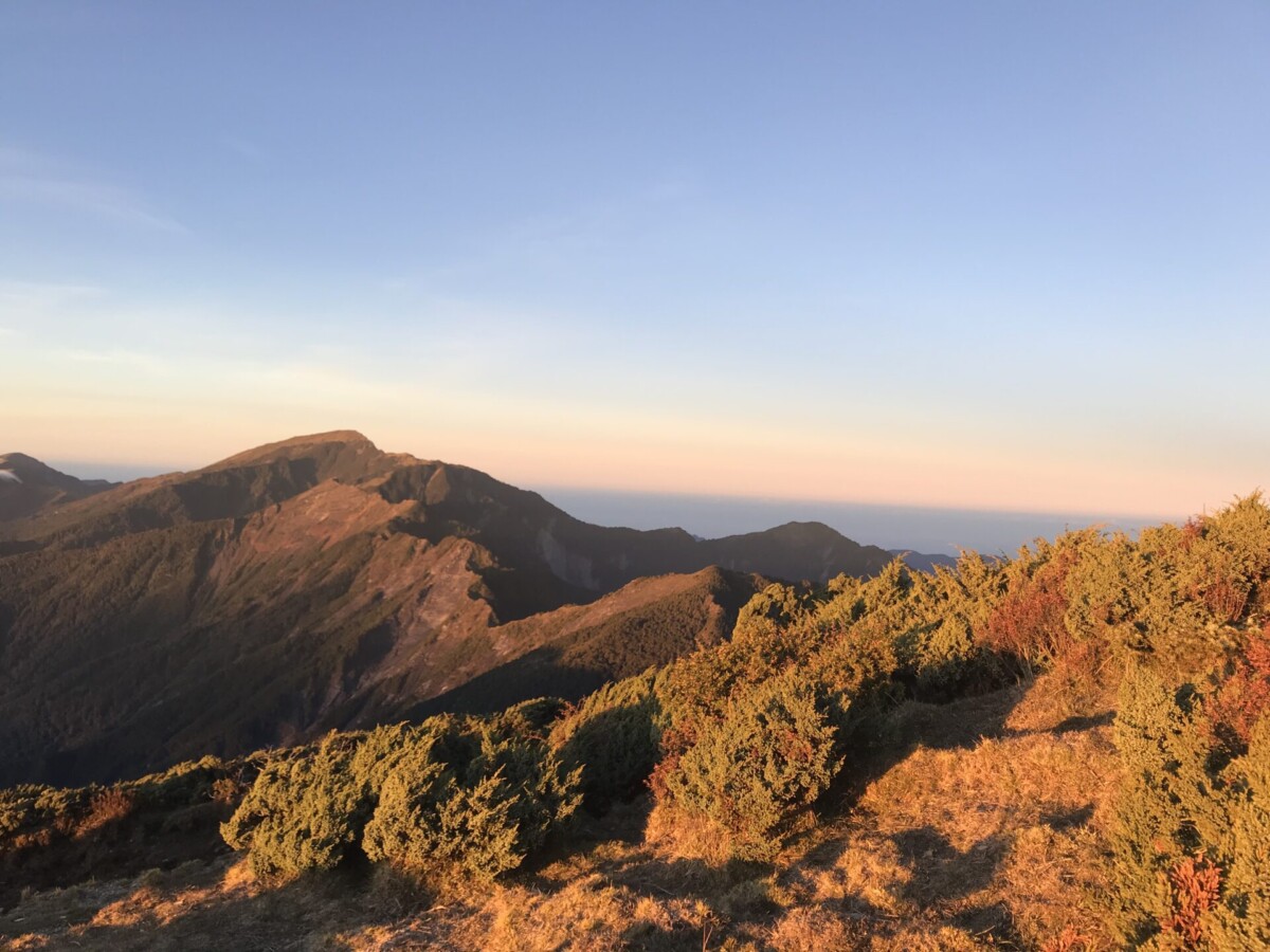 開心的是,在D2的重點日,天氣晴朗,早上欣賞到太平洋上的日出;登頂視野很好,可以看到玉山的聖稜線;傍晚回程,碰上四面八方滙集的超級雲海。