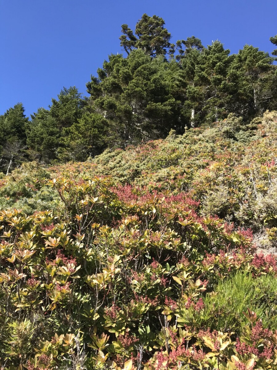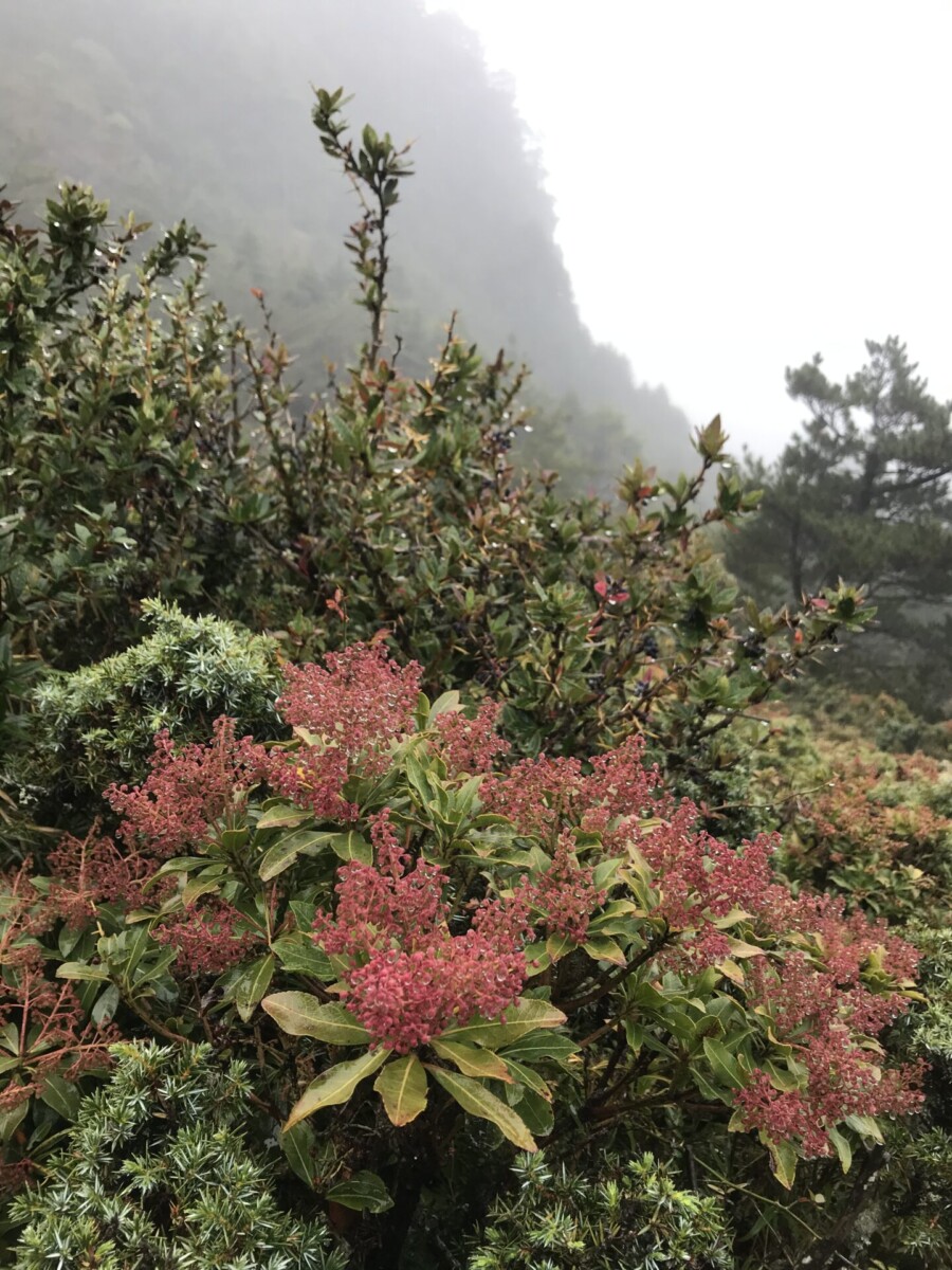 山坡上含著紅色小花苞的台灣馬醉木,令人對高山植物選擇在初冬含葩待放的韌性,不禁致上最高的敬意。
