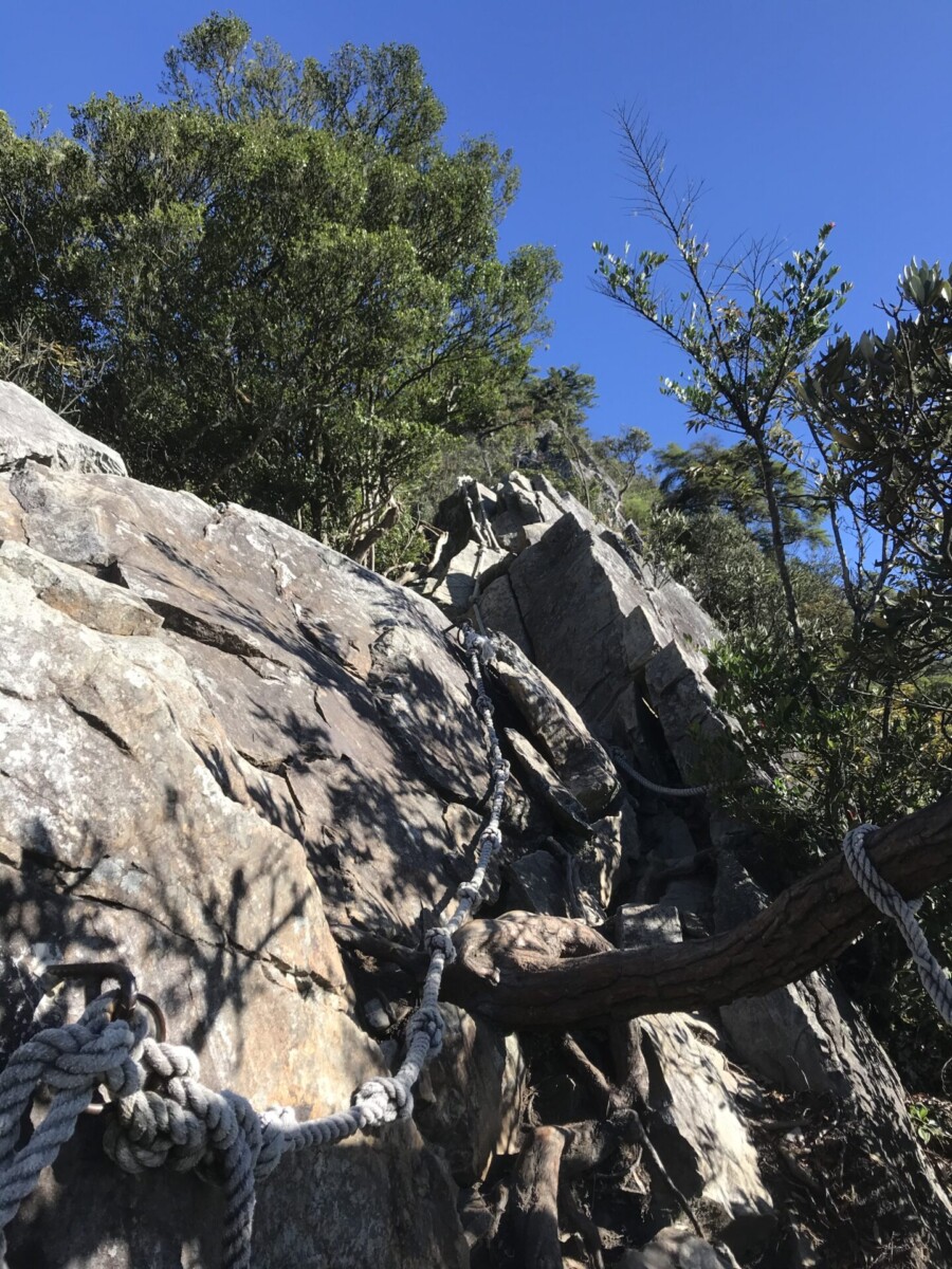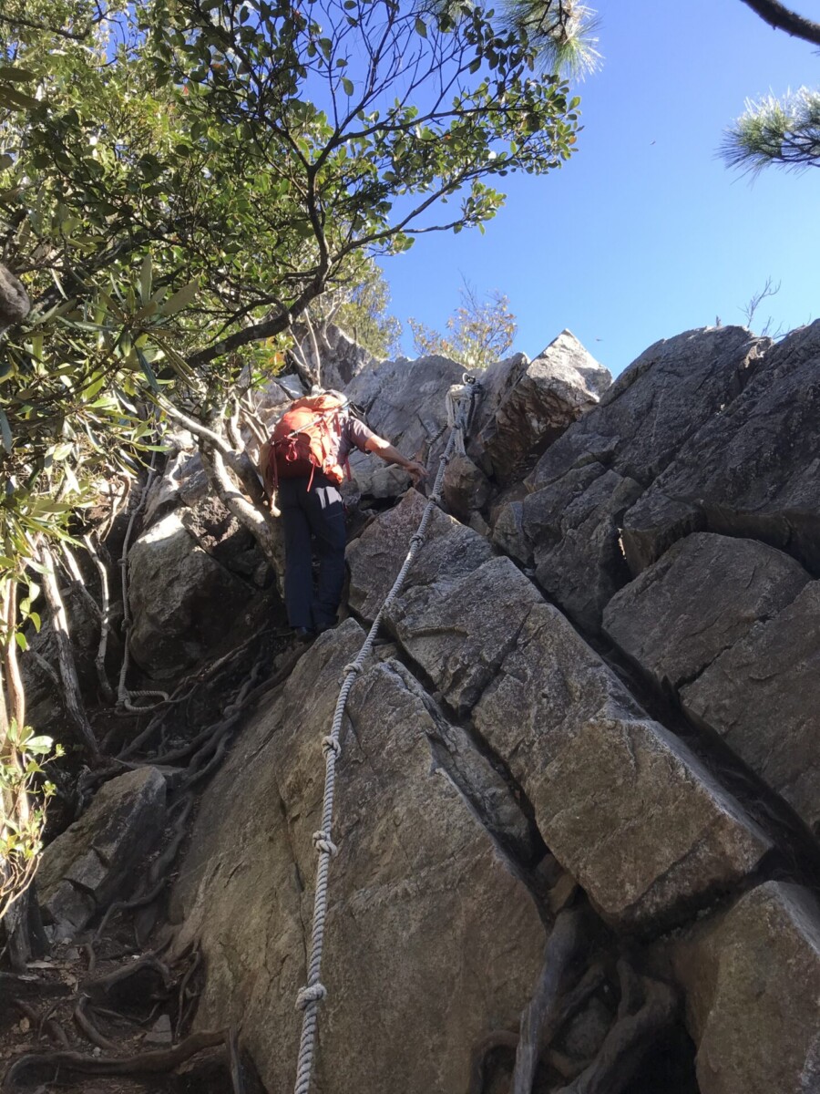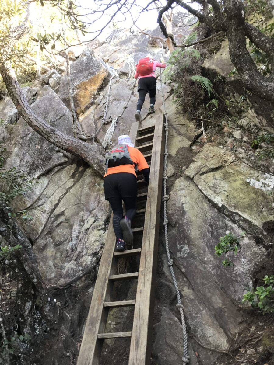 話說鳶嘴山的特色就是攀岩。據說以前曾經摔死人,現在釘了不銹鋼的腳踏,拉繩也變粗了,因此只要按步就班,小心踏點,其實是很安全的。