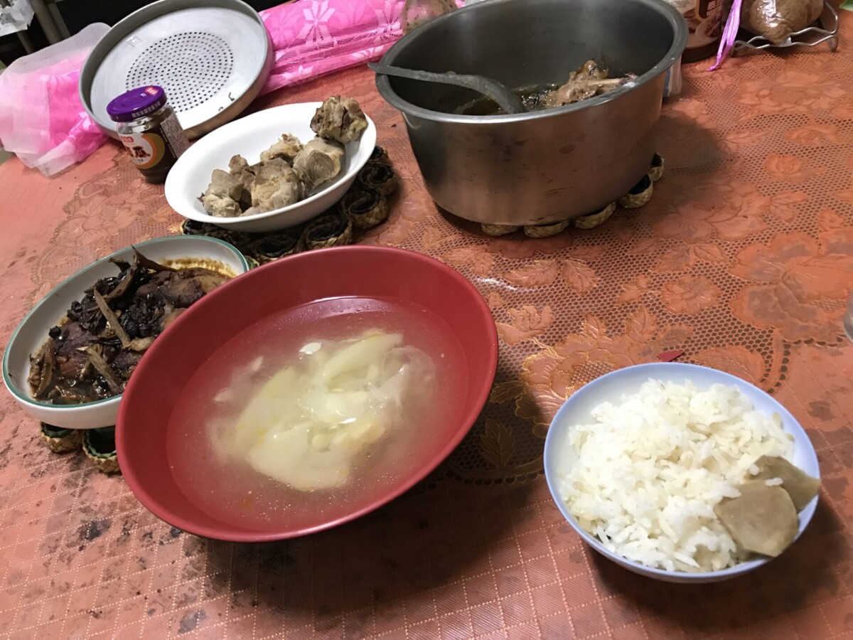 她端上一鍋紅燒的鷄肉骨之類的,一盤煎魚,和一大碗公的蒲仔湯,然後從電子鍋用一只青花的懐舊陶碗,為我添了一大碗熱熱的飯。