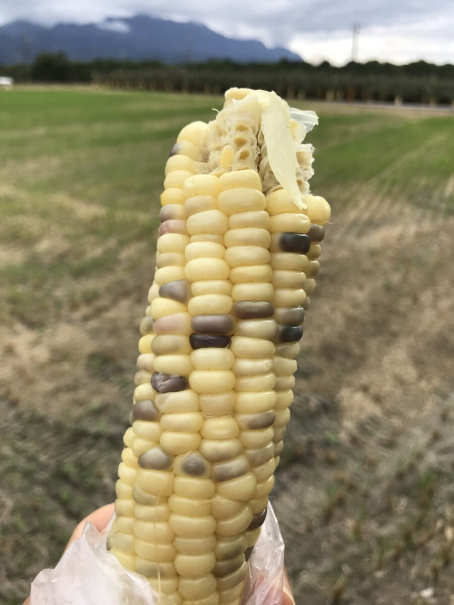 有一位站在攡子裏面後方,正啃著玉米的先生,跟我隔空喊話說,玉米都老闆娘自己種的,有機的啦!是越南種的糯米玉米,咬起來QQ的,很好吃喔!