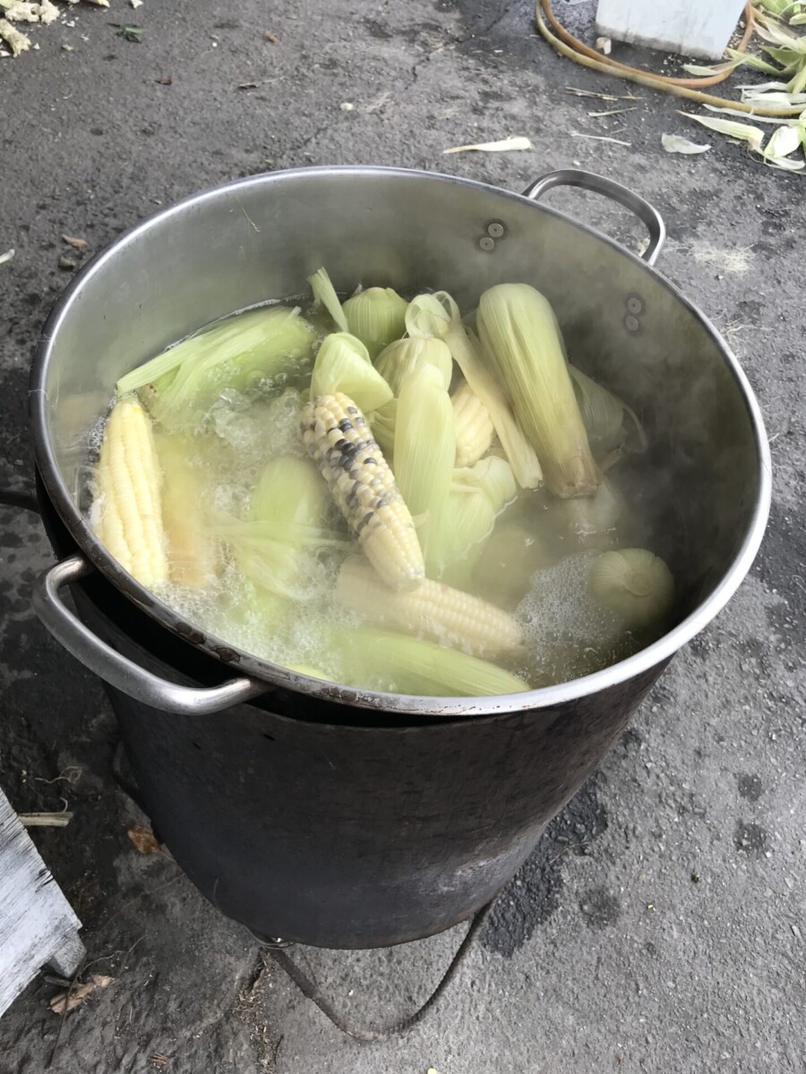 老闆操著濃濃的外國口音,用上揚的音調說玉米是她自己種的,然後一邊指著攤位後面的農田,一邊就拿起玉米串,往一個淺鍋子裏迅速去抹上鹽水,我都還來不及阻止。