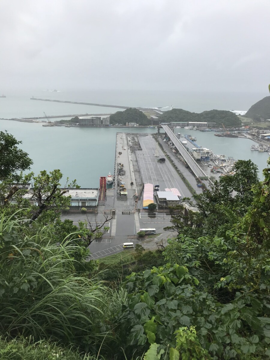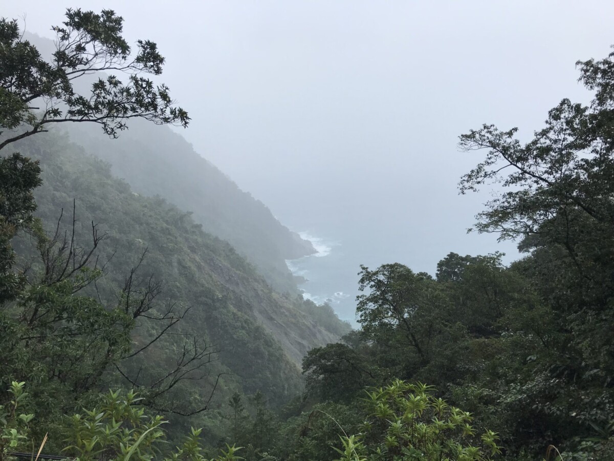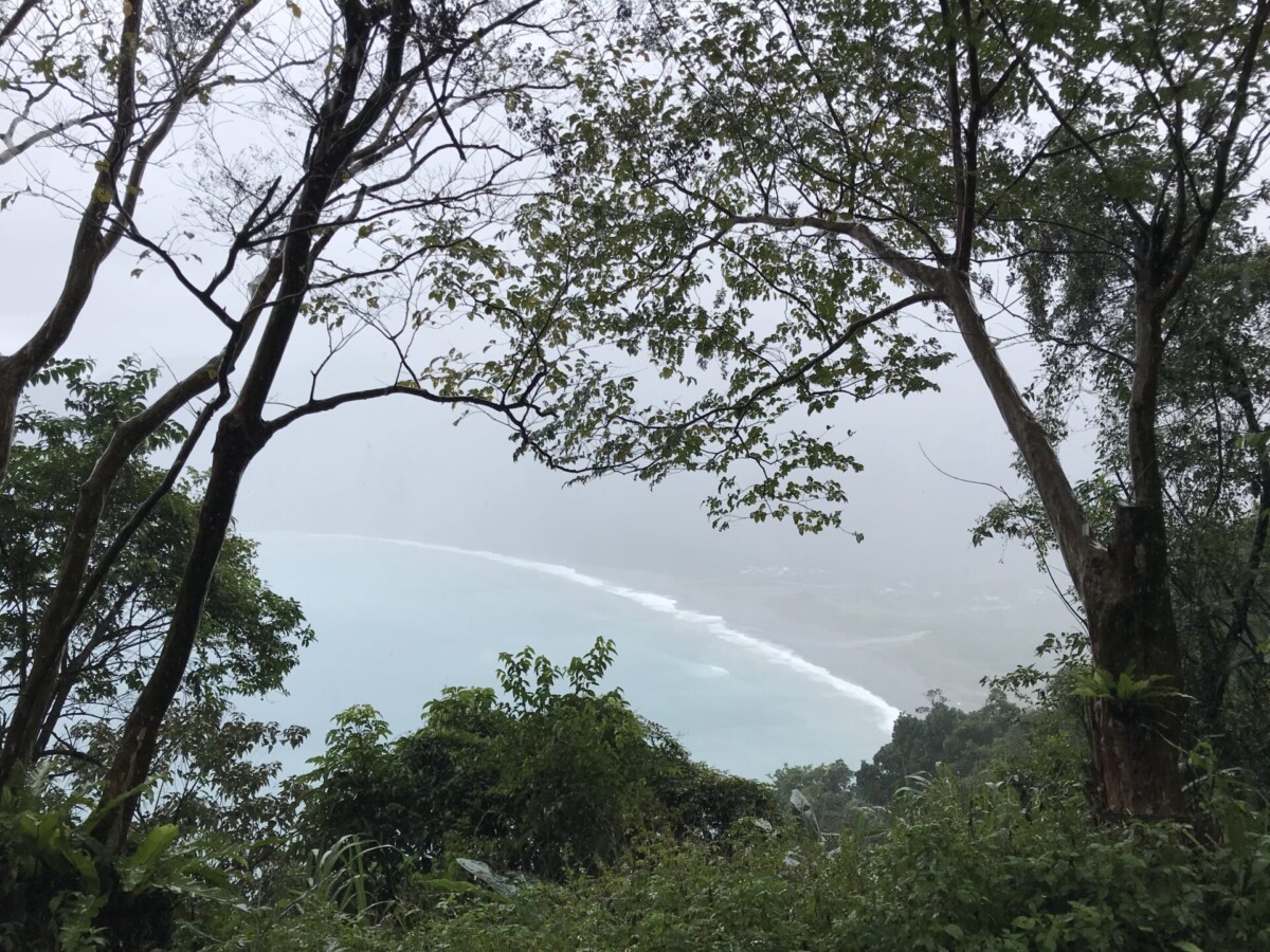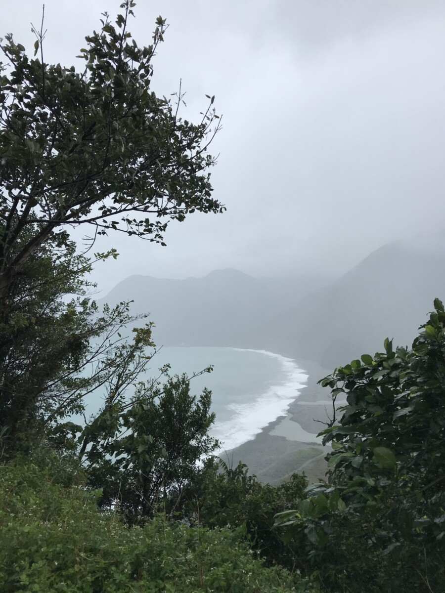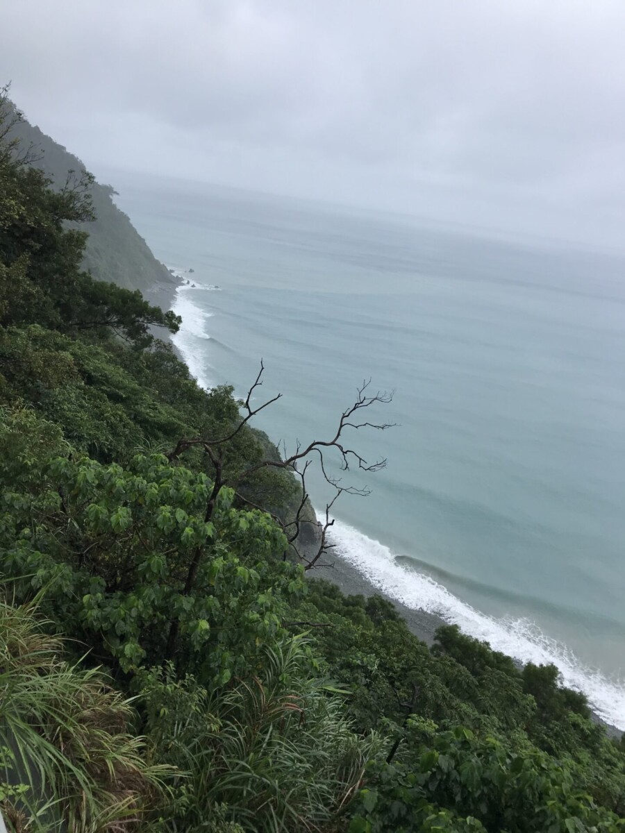 由東澳上9丁道路向北,登上高處往回南望,好似一勾新月的粉鳥林海灘,就幽微在懸崖邊下濛濛的細雨裏了。