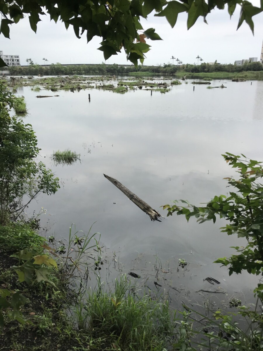 我看著羅東林業文化園區貯木池內,泡在水中靜靜沈睡的老樹幹,已經抹上了綠色的苔蕨和小長了些許的雜草,不知是否也有林義雄先生的父親,在過手時所留下斤斧的痕跡?