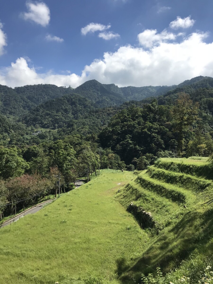 我在竹35號公路靠近騎龍的位置,向右向山谷下走入了騎龍古道。其中有一小段的古道,就剛好位在那群梯田地最上面那畝的上緣。而那段古道是崩塌的,就可以知道那個山坡土質是多麼的脆弱。