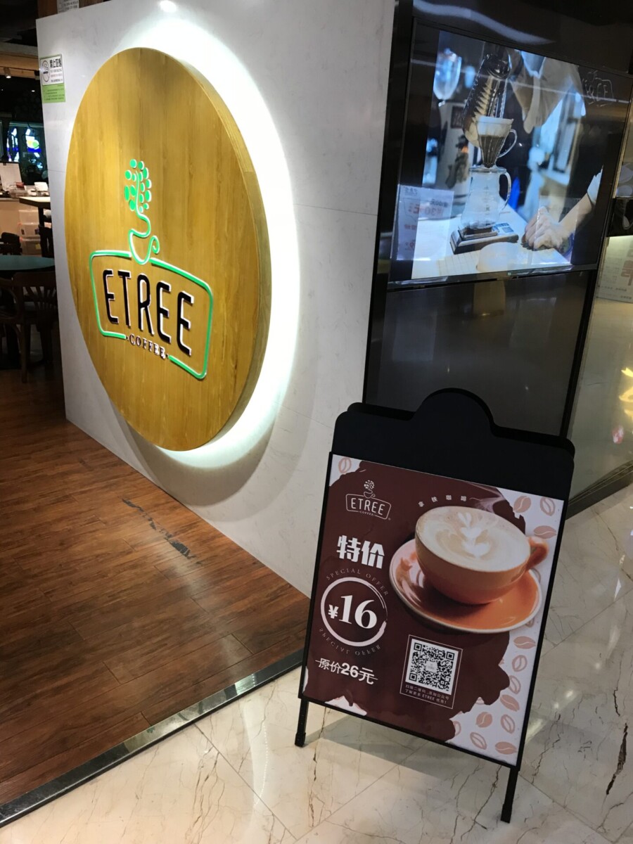 在門口的落地立牌上,廣告著只要關注微信公眾號,咖啡拿鐵大優惠,一杯只要人民幣16元。