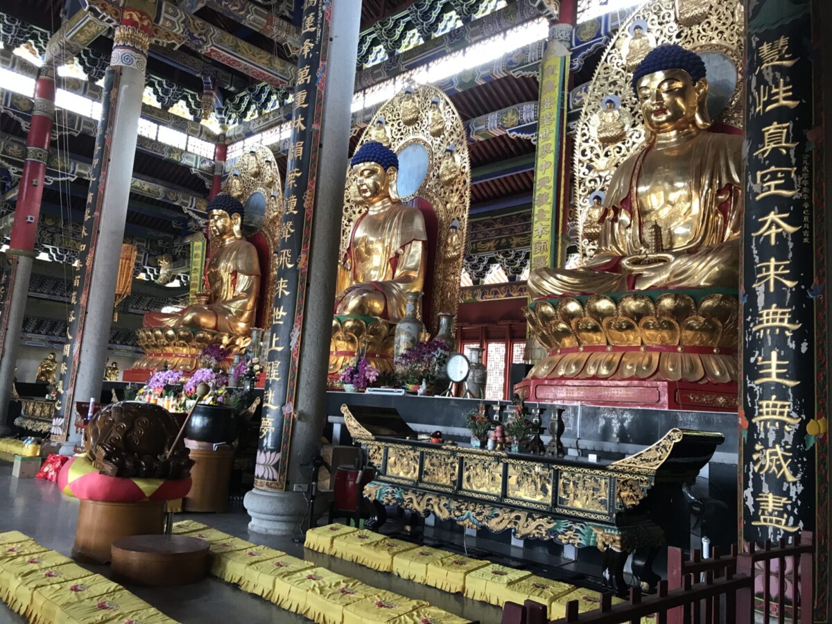 大雄寶殿內,釋迦牟尼佛端坐當中,左邊是藥師佛,右邊是阿彌陀佛。只要在正殿前頂禮摩拜一番,也就一敬三佛了,並不費事。