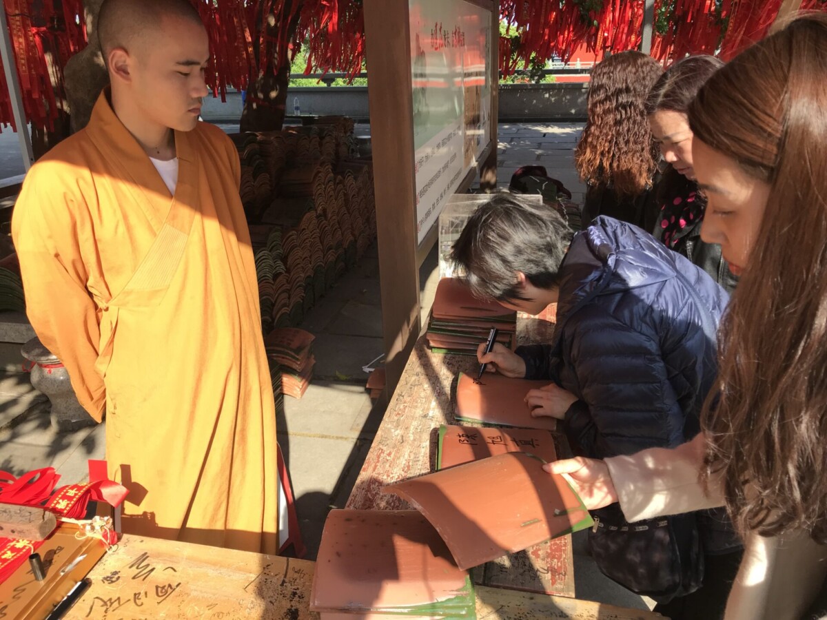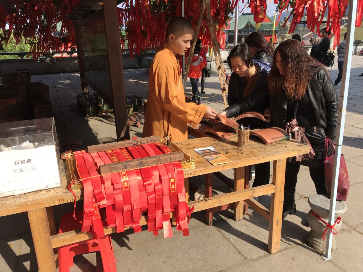 在大雄寶殿的左側,有位長得乾乾淨淨的小師父,慈眉善目地守著一個堆滿瓦片的攤位。