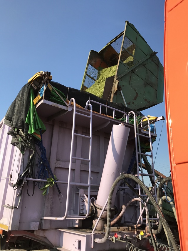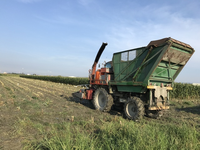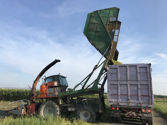青割玉米用機器採收,一趟可採收二行玉米。切碎的玉米莖、葉、玉米,先充裝在收割機的後斗裏。滿了就直接倒到在田邊守候的大卡車上。
