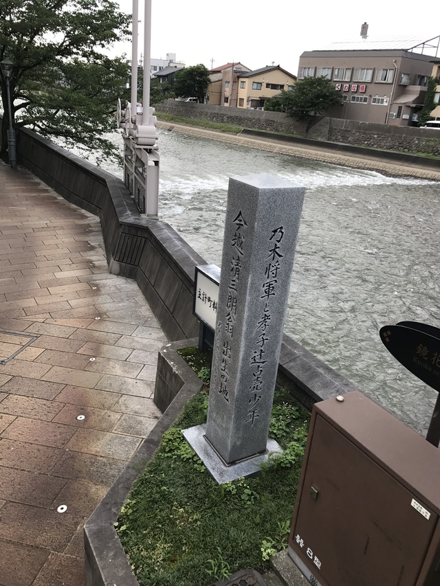 在金澤淺野川旁立的方柱立碑上,一面刻著「乃木将軍と孝子辻占売少年 」,另一邊刻著「今越清三郎翁出生の地」。