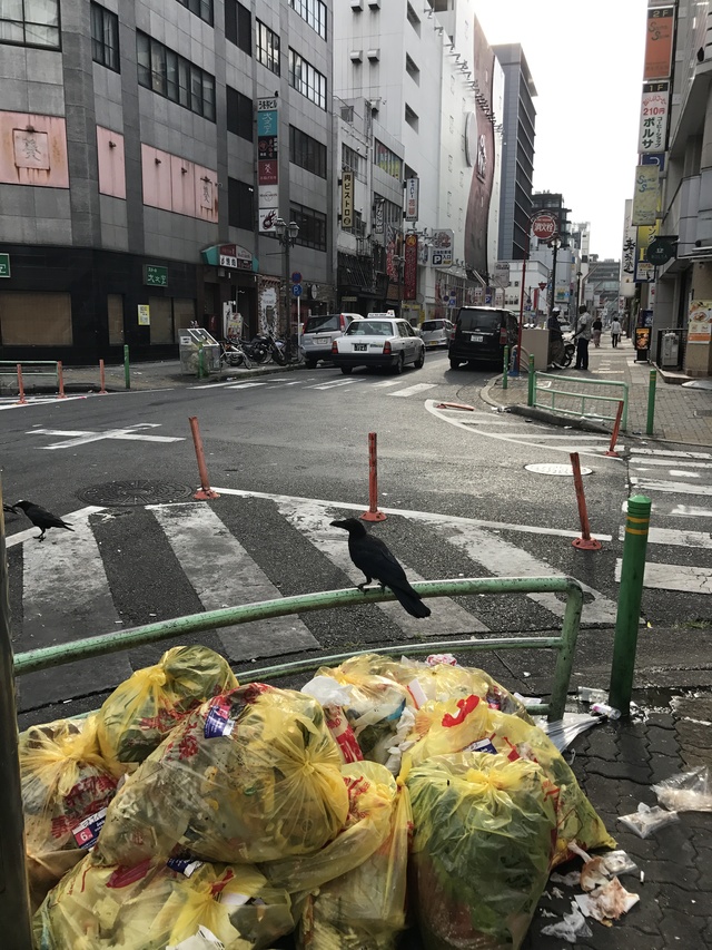 這條名古屋的街市,經過昨夜的狂熱,在星期日的早晨,人行道堆放著商家産生的垃圾。烈酒的透明玻璃瓶子,用大的塑膠袋裝著,一袋又一袋的,喝得好多。日本人,還真的好苦悶。