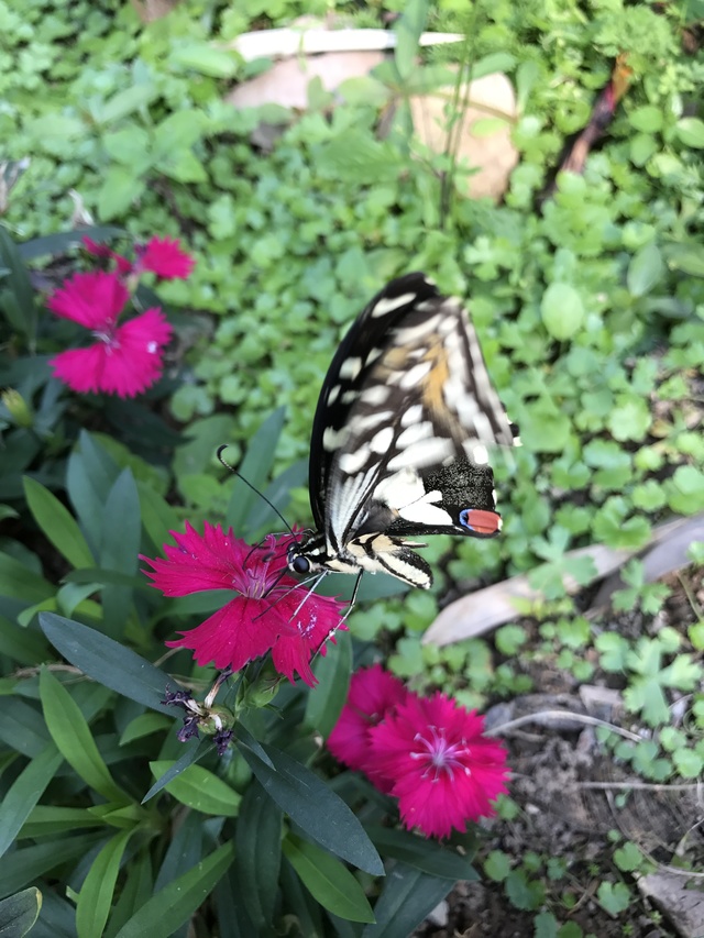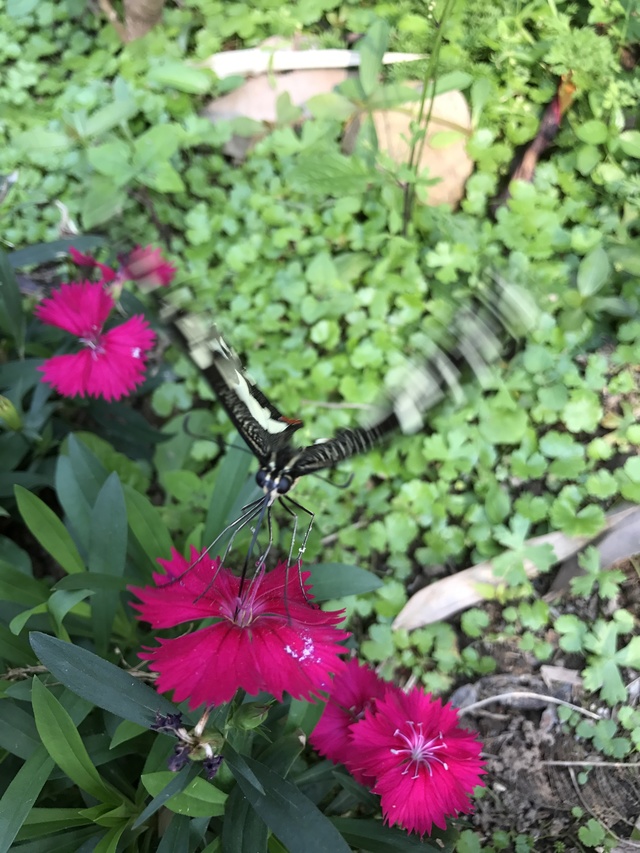 在台北大安森林公園,偶遇一隻蝴蝶,貌似花鳯蝶,在紫紅色的石竹花之間來回辛勤採蜜。看它猛振翅膀,超過了正常的頻率,相機怎麼照都照不清楚。後來我才發現,它的左翼受傷嚴重,幾乎都已經完全失去了,難怪它必須如此努力去震動翅膀。看著勇敢的小生命,不畏在美麗上的缺損,依然全力以赴地奮鬥著,令人心生敬意與感動。或許它表面上比一隻正常的蝴蝶擁有更少的美麗,可是它在我們的心目中,已經達到一種極致的境界,不能再多添一分一毫的美麗了。