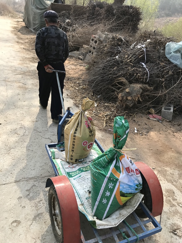 我先搭到复城市區,然後花人民幣30元,直接搭私家車到了孫爺奶農舍的門口。這時我看到了孫爺拉著肥料的背影,不禁開心地大叫了起來。