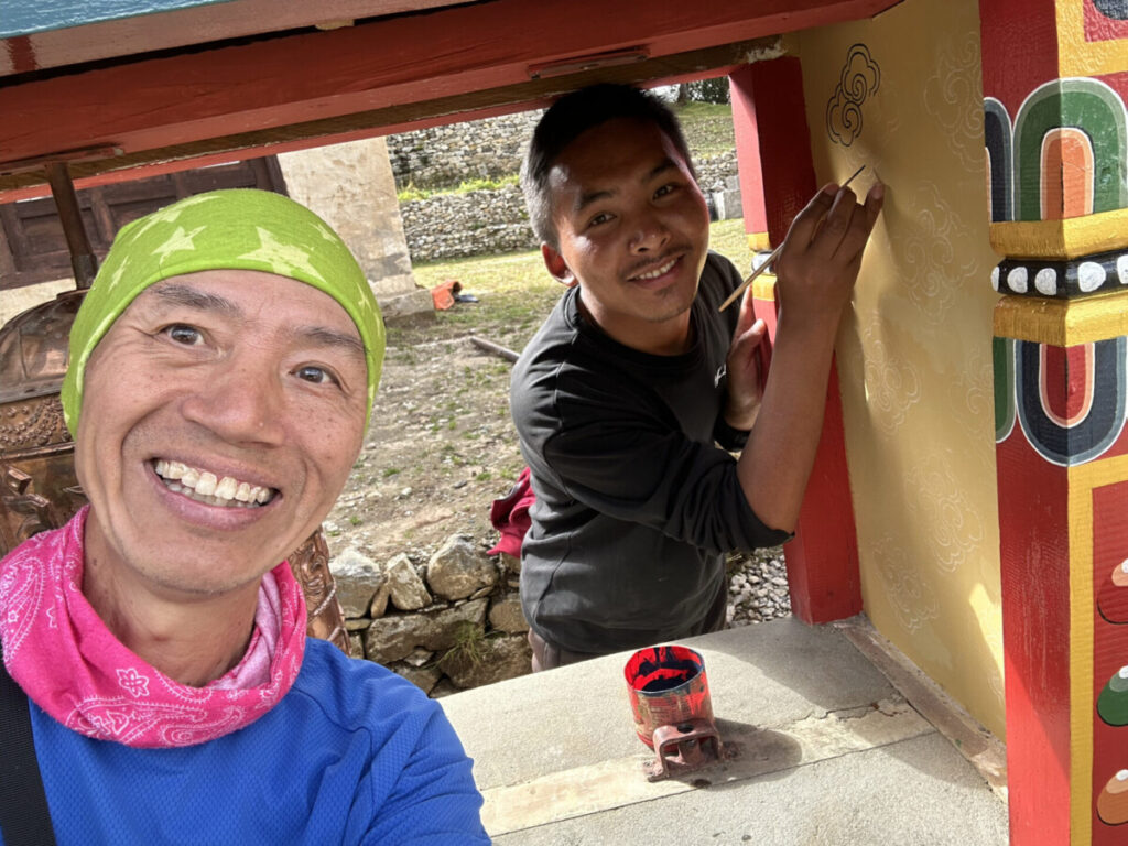 話說在EBC的第四天,抵達了Tenboche(湯坡崎)的山屋旅店,旁邊的寺廟正在整修。有兩個年輕人正在彩繪牆洞中的裝飾,我看到是中國式的雲紋圖,就靠近去看。