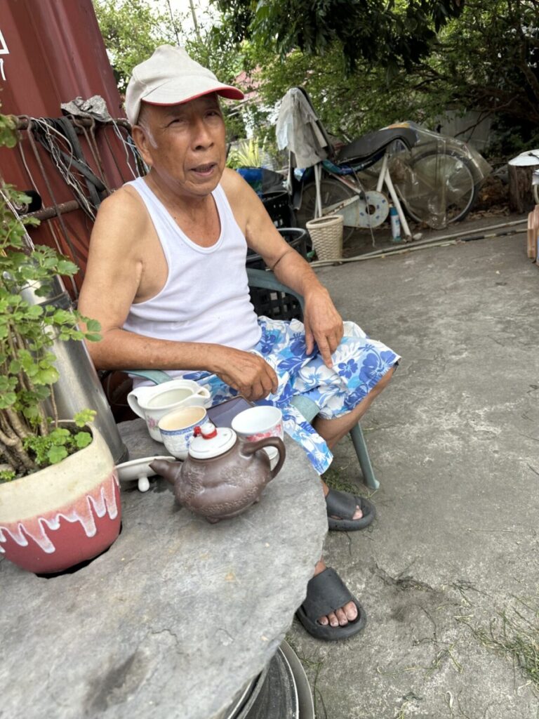 他拉了一張塑膠椅子給我坐,我就在龍眼樹旁喝起他泡的茶。