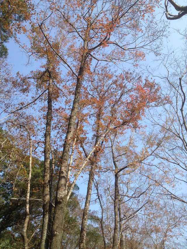 桃園石門水庫邊壩的山坡上種滿了青楓。雖然青楓的名字內有一個「楓」字,但是青楓是槭樹,和楓樹是不同的。元月初的青楓,落下的紅葉都已經在地上捲轉成棕土色,只有少數一兩棵還掛著一些晚熟的紅,引人暇想曾經在這裏滿山滿谷燃燒的浪漫。葉已落盡的枝頭,長滿了小小圓圓的蒴果,早熟墜下的結果則沾了泥巴,一個個你不會想去撿拾的無情。青楓是令戀人們羨慕的雌雄同株,不用回頭,不用眾裏尋它千百度,在同一株臨近的枝頭,就有大量幸福美滿容易戀上的自己。元月初的青楓落了大量的葉結了點點的蒴果,挺立在山頭風櫃口的冷風中,伸展著乾亁淨淨的蕭颯,有北國悲絶的風情。當人們仰望著這些參天的喬木,爭論著到底是浪漫的楓樹還是假楓樹之名的槭樹,還好聰明的人管它們這些槭樹叫作青楓,四兩撥千金解決了大家心裏這個不該沈重的問題。要看去年的青楓紅葉,我們來得有點太晚,但如果說是要看今年的,那麽就真是太早了。不過,此時少了誇張的紅葉,我們反而看到眾多生命的蒴果,以及直干天際抖擻堅強的枝條,也算是不一樣的收穫吧! 2015/1/2 石門水庫的青楓 Damakey