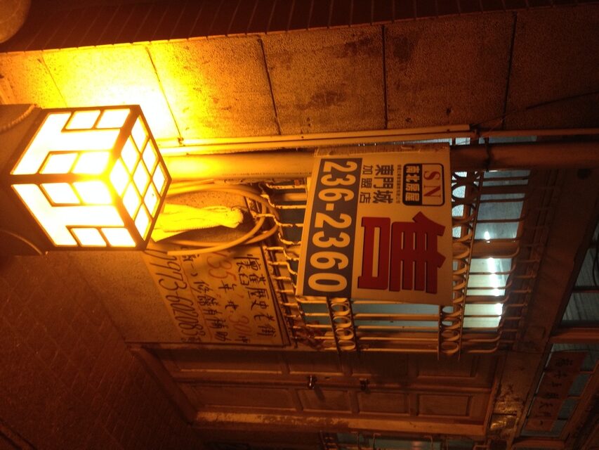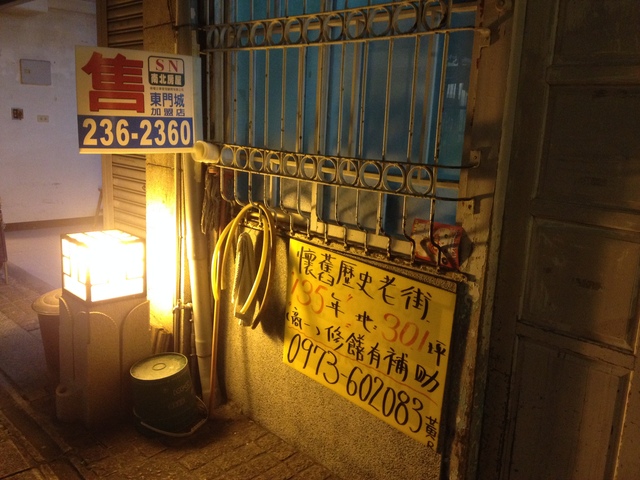 從海安路轉入神農街,夜色把這條台南的老街塗上了黑黑的妝,和室般的方型宮燈靜靜蹲在街旁,照亮了旅人好奇的單眼相機。有人把慢食擺放在這裏的古老,等你脫去風塵僕僕的俗鞋,入內甘心購買,現代城市稀缺的悠閒。有人把空白的筆記本,包裹了阿嬤的大花布來賣,童年用夜尿繪深了顏色一樣的床單,俗艷溼溼的記憶。有棟老房子號稱有135年的歷史,被仲介當街拍賣,不知買的人會看上的是它過去的滄桑,還是不確定的未來。2013/12/21 台南被拍賣的老房子 Damakey