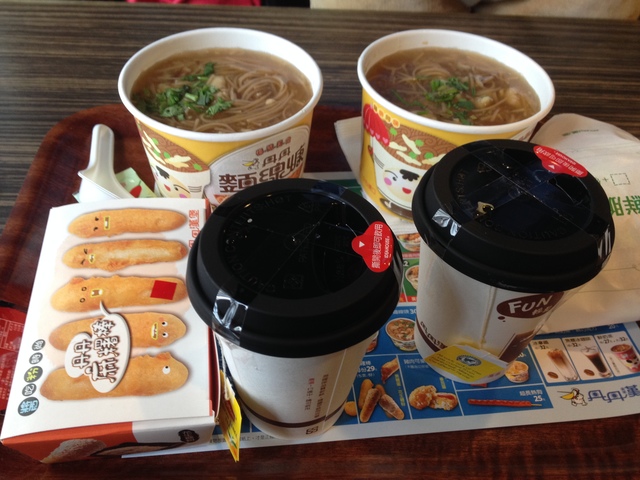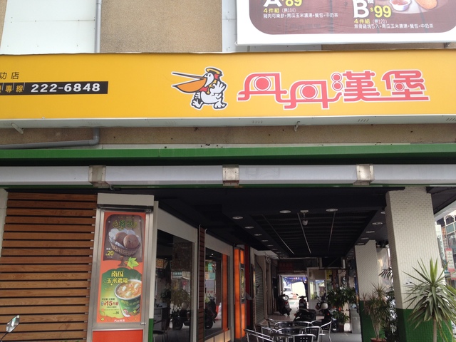 昨天去台南的大潤發,開車經過成功路,小娟媽看到網路上評價很高的丹丹漢堡,今天一早就趕過來嚐。除了西式的漢堡,他們還理直氣壯地提供了廣東粥、麵線焿等中式小吃。我們㸃了漢堡➕麵線焿,配有飲料、中西合璧的套餐。怕吃不飽,又加點了一份麵線焿。麻糬棒據說很好吃,也來一份。漢堡和肯德基的味道接近;麵線焿投台南人之所好,偏甜;麻糬棒是炸的,很有炸年糕的味道,頗暖胃。可能是一大早的關係,舊舊的廁所打掃維持得非常乾淨。內部的座位偏黑褐色條紋,設計得不十分高明,小娟媽提醒我這只是一間快餐店而已,言下之意是不要要求太多。吃飽兩人只需台幣157元,蠻超值的。2913/12/18 丹丹漢堡 Damakey