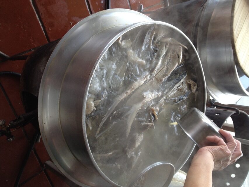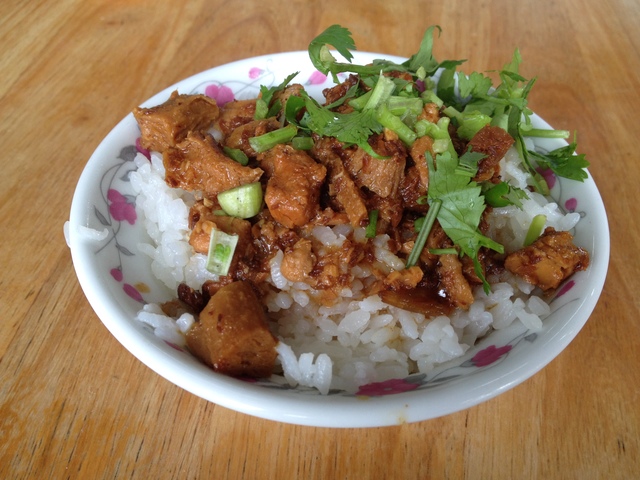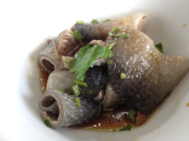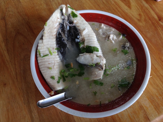 阿憨鹹粥位在台南市公園南路和忠義路囗。我們吃了店裏招牌的小吃:虱目魚粥、魚皮、魚焢肉飯。老闆娘看我最後乾吃著魚焢肉飯,還古道熱腸地加了一些粥湯給我。她說,阿憨鹹粥只開名店,不開連鎖店,因為怕品質難控制。以前曾經有個機緣去台北開個分店,後來負責去開店的那個人因故離逝,覺得沒那個緣份,開分店的事後來也就不了了之了。老闆説虱目魚還是必須用台南的,以前曾試用台東的但發現魚的品質實在不行。可能是水土和緯度的關係,以前有人試著在海南島養殖虱目魚,飼料也餵得不少,但應該是肥美的虱目魚,硬是長成瘦長的秋刀魚,虧了很多錢而終告失敗。老闆娘説,她只買最好的虱目魚,用現金在一星期內付清,跟別人隔月再開三個月的期票不同。臨去看到大鍋裏整條剖半的虱目魚在熬煮,老闆娘説這就是煮粥的高湯不惜工本的秘密,大方讓我拍照,言下之意頗為自豪。2013/12/18 阿憨鹹粥 Damakey
