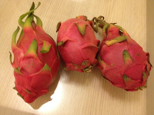 廣州大道中有家專賣榴槤和火龍火的店。從進貨的紙箱可以看得出來,各種品級的榴槤是來自泰國的。滿頭尖刺的榴槤整排堆疊在店的右側,金光閃閃,這對喜歡榴槤的老饕是一大福音。當然榴槤價高,需求彈性低,愛吃的人趨之若騖,不愛的人避之猶恐不及,所以從來沒看到老闆把榴槤的賣價標示出來。而紫紅色的火龍果排在店的左側,用粗粗的黑筆在板子上寫著「三個10元」。那火龍果約莫二個拳頭粗,賣這個價一個換算約新台幣十五元,很便宜。這讓我想到上次在汕頭海邊參觀的火龍果園,了解到火龍果花像曇花一樣,盛開在蜜蜂、蝴蝶休息的晚上,為了增加結果率,費事的人工授粉免不了。結果之後,各式的鳥類還會連袂來搶食。照顧起來很費心力。一個賣台幣十五元,很難符合成本吧!我好奇地買了三個,老闆說那些火龍果來自越南,我恍然大悟。越南的火龍果味道還可以,價格那麼低,不知廣東本地種的怎麼跟它競爭。那台灣種的呢?2013/12/12 3個人民幣10元的火龍果 Damakey