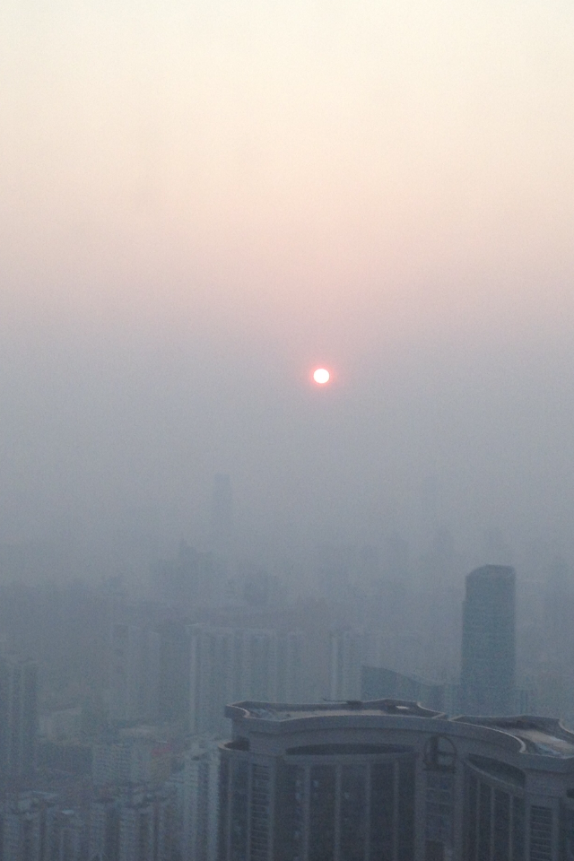 登上廣州中信廣場大厦的第64樓,從Canteen朝西望去,看到PM2.5漸層的灰階,烘托著一夜沒睡的太陽紅眼。這座南國的大城,擠滿了建築的巨人,在地平缐上,爭站不到一個清晰的位子。今天開始吹起了風,可是霧霾並沒有認真地散去,而是繼續盤桓在街頭巷尾。我懷疑早起的廣州,忙了一天都尚未洗臉,否則秀麗的笑容,怎麼會還抹著一層層的灰黑。夕陽即將沈淪,登樓的即將歸去,留下一窗骯髒的美,帶走不敢歡𣈱的呼吸。2013/12/9 太陽紅眼 Damakey
