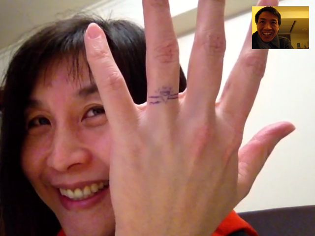 小娟媽撥弄了一下頭髮,感覺不太對,五隻手指伸張在眼前,她瞪大眼看著,不禁大聲尖叫了起來:「我的戒指呢?!」然後她搓著左手空了的無名指,馬上趴在地上狂找了起來。我問她從泰國出差回來,記得戒指有戴回來嗎?她搖搖頭説,這結婚戒指戴了二十一年了,太習慣了,也不記得是否從泰國回來時有沒有戴著。拿出皮包,沒找到。又來回主臥室兩趟,依然毫無斬獲。她一從泰國出差回來,就把家裏上上下下打掃洗刷一番,但這個戒指卡著指骨,絕對不會如此輕易就滑出來的。小娟媽回想,該不會是在泰國按摩半醒半睡的時候,戒指被脫了下來不成?小娟媽空白的手掌撐起無奈的臉,我説再買一個更大的送給她,她露出短暫慧黠的笑容。我說,如果想要一個更大的鑽石戒指,也不需要編這麼曲折的故事。我們兩眼相望四目相對,她露出了苦笑,我知道事情有點大條。我説不過是一個小小鑽戒,不要因此不開心,再買一個不就得了。她説那鑽戒戴了二十多年了,我不懂她的感受啦!她今天晚上在手指的戒痕上用筆畫了一個戒指上去,自拍傳到Facebook上,她的姊妹都說好悲催。小娟媽說每天都要畫上一個更大的,直到我回台灣買一個補償她為止。2013/12/5 每天畫上一個更大的戒指 Damakey