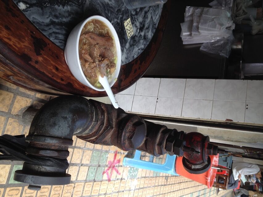 這家開在廣州五羊新邨明月二路的小店,標榜賣的是傳統的銀絲麵。以前經過這裏,從來沒想到去吃,尤其是因為在店前面有一個人漫不經心地坐在那裏麵票,太像一個普通的食堂了,讓人提不起勁。這店的邊上,挨著一個很突兀的消防水龍,今天我想坐在那一桌,感覺一定很不錯。我把裝滿菜的環保袋掛在那根消防水龍上面,期待起牛腩銀絲麵。牛腩帶了筋,細細的麵很容易入口,湯頭放了蒜苗,令人想起台北民主東路大排檔無限供應的熱湯,很讚。那消防的水龍銹蝕嚴重,不知能否再開啓來噴發滅火,還是只能繼續守口如瓶封印了的歷史。2013/11/24 銀絲麵 Damakey