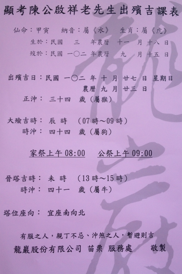 親愛的老爸,我們今天聚集在這裏,要恭敬地跪送您,順利走完人生的最後一程。您將因此功德圓滿,一路平安,因緣輪迴。但在我們的心中,從此將深深烙印上,一個永遠也抹不掉的缺憾。請您引導我們的徬徨,順著您憐憫的目光。請您撫慰我們的悲傷,透過您關愛的手掌。匍匐在您的靈前,是困在庸庸碌碌的俗世。徘徊在有限的送行時間,是我們無法一一細數,您一輩子的豐功偉績。您繁衍的子子孫孫,男女老少總共一百零九位,您心臟曾經的跳動,超過了三十七億八千萬回,您用這些不可能的數字和一百年漫長的時光,證明了您比絶大多數的爸爸,都還要堅強。您就像是一顆自燃的恆星一樣,雄倨在暗夜的中央,而我們就像環繞四周的行星一般,朝著您遺留下來的巨大黑洞,任由心情失重墜落,深淵裏的無常。我們必須繼續人生艱苦的旅程,而您就要成仙成佛,比全宇宙任何的人或神,都還要過得更快活。抵達苦海外的極樂門,見到了我們久違的老母親,請您幫我們連上相思的心,用您修煉百年的大智大慧,加持百萬倍的愛來仔仔細細地疼。老爸,一公噸的眼淚也洗不亁淨我們蝕刻在臉上的傷悲,您一百歲的生命也滿足不了我們貪婪在心裏對永遠幸福的渴望。秋深露凍風寒野曠,女兒們親手縫製長壽的衣,您要經常地穿,莫要再埋到發霉的櫃子裏。山高水長千里迢遙,燒給您的銀錢,沿途要盡情地發放,莫要再累積在戶頭裏一個冰冷的地方。阿爸!把您的捨不得,都留下來給我們吧!喝下忘情的水,在黃泉路上,不要再擔心回頭我們孺慕的殤。踏過重生的火,在奈何橋外,從此安安樂樂地邁向永久。老爸,一路好走。