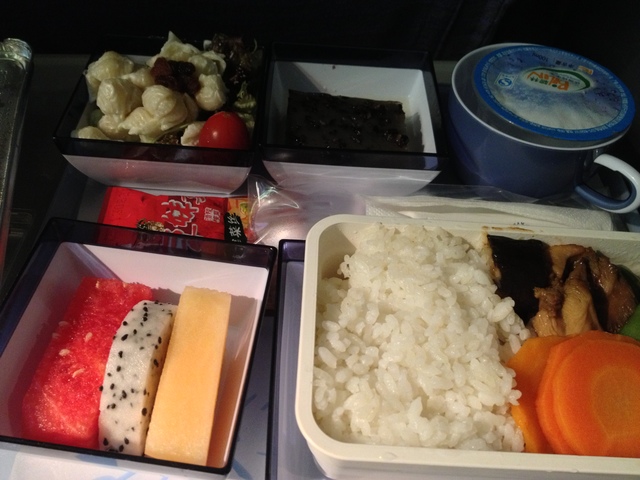 晚餐有:水果是西瓜、火龍果、蘋果三色,Cheese生菜,紅豆糕沾牛奶,主食是鷄肉飯。有一包辣妹子榨菜是為了迎合陸客吧!讓我想起以前在飛機上碰到的湖南大娘,拿出自製的辣椒醬猛吃,還用同一雙筷子夾出來問我要不要也嚐一嚐,偏清淡的華航飛機餐他們吃不慣吧!不知是不是心裡作用,那次之後總覺得華航的飛機餐好像悄悄變得比較鹹了呢!
