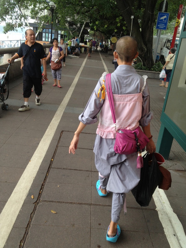 今天在廣州珠江邊沿江西路上,看到一位女尼,在灰色的袈裟上,穿了白蕾絲粉紅色網狀背心,腳上的綁腿上也用粉紅色的帶子綁著,背著絳紫色的皮包,上面佛珠扣環的墜飾也是絳紫色的,腳上趿著一雙鮮藍色的Cross布希鞋。我很好奇,她是怎樣一個修行的人,怎會有這樣奇特的打扮。