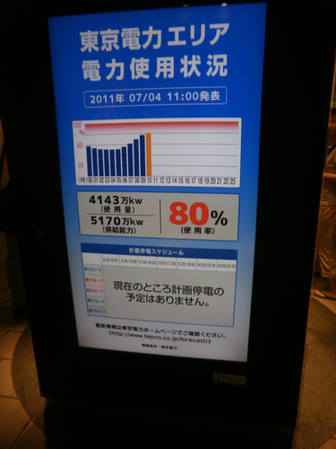 市區做生意的店家,也配合節電,調高冷房的溫度;拆去燈泡或關閉部分的燈源;每一家門口都張些著"節電中,請見諒"的日文說明。據說,每一戶人家,也都自動自發花錢買昂貴的省電燈泡,一起想辦法來節省兩成的電力。