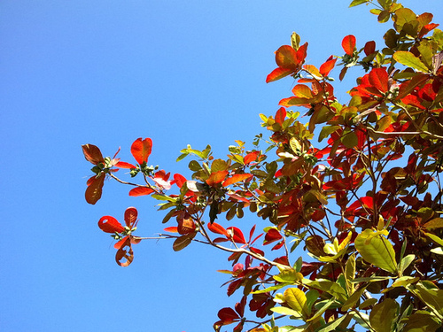 操場邊的橄仁樹(Indian Almond, 學名 Terminalia Catappa,使君子科 Combretaceae),綠色紅色相間的葉子,襯著藍藍的天,讓人看了心曠神怡。
