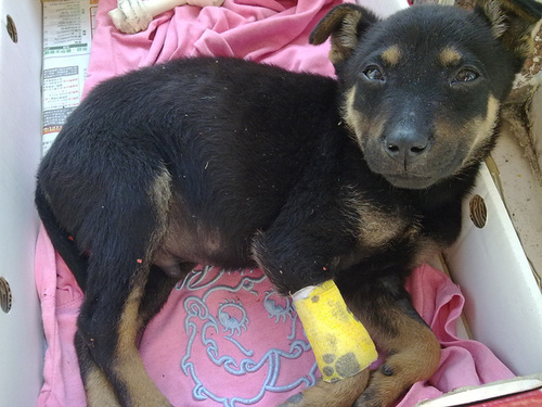 大熊抱回來的時候,活蹦亂跳。小舅媽看它可愛,年前幫它在炎熱的下午洗起澡來,還特地選用了香香的肥皂,沒想到大熊居然因此得了感冒,變得奄奄一息。去看了獸醫,還說發了燒(狗狗的體溫比人體多約一度),有肺炎的症狀。除了灌食藥物,獸醫師還開了營養針。狗狗沒有健保,一診要台幣六百大洋,年初一和年初二回診,還得再多付兩百五。為了大熊,真是不惜工本。