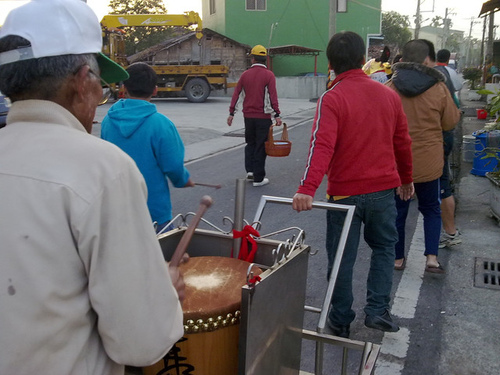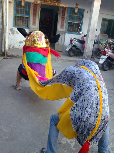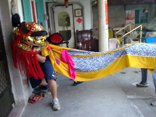弄獅的陣頭,由幾位村中的長老,以及幾位青少年組成。青少年輪流弄獅,一人掌頭,一人甩尾,弄獅的節奏就配合著鼓點的節拍。一般打鼓的都是較資深的師傅,旁邊有一些幫眾,用鈸及小銅鑼,就跟著鼓的節拍敲打。老丈人說,全村約七十多戶,要一戶一戶地去弄獅,以討過年的吉利。以前古老的傳說,有"年"這樣的獸,我想敲鑼打鼓,就是要去嚇嚇"年"獸,讓大家接下來一年都平安順利吧!