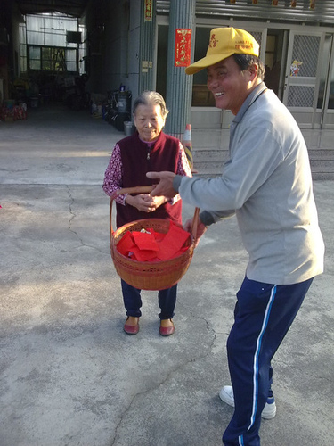 弄獅團離去時,民家主人就會致贈紅包賞金,走一趟下來,竹籃子就裝滿了紅包。也有一些人家,附贈一些菸酒飲料之類的,人情味十足。