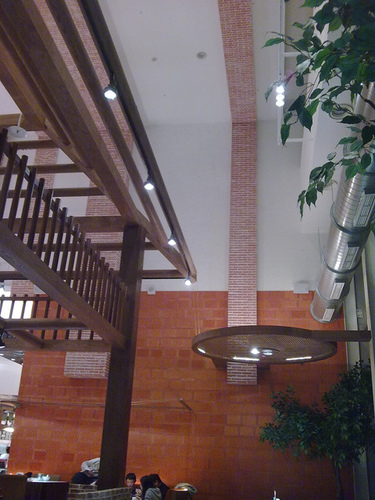 這一個家店,室內用粗細不同的角木,裝置了木屋般的架構,像古代吟詩作對的樓閣。牆上貼了半滿的大丁掛,展現黃橙橙的古典東方三合院印象。紅磚從半高處向上延伸到天花板,提醒我們烘培幸福的老柴灶。坐在這裡,可以吃香喝辣,可以咬文嚼字,可以發思古之幽情,可以複習家的溫暖,可以增益彼此的感情。