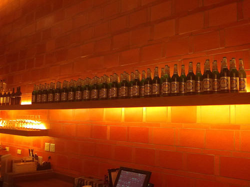 門口櫃台後面的層架,排滿迎賓新穎的酒瓶襯著古老的牆,加上夕陽般暖色系的間接光源的渲染,營造出融合古今的類PUB吧台。站在這裏,恍如置身通往古今的時光隧道,記熟悉又驚奇。