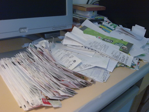 拉開抽屜,驚覺溢滿的發票,弄得整個抽屜連個小小的錢包都再也塞不進去了。一直想整理,但一年拖過一年。在這新年的開始,狠狠把它們都撈出來攤在桌上清理:發票就收集起來捐給慈善機構,加油的發票留待小舅子報帳,至於其他的提款單據之類的,都有一些比較敏感的個人資料在上面,只能耐著性子就用碎紙機一張一張地碎掉。雖然是小小的一件事,完成後讓人神情為之一爽,有全新開始的感覺。
