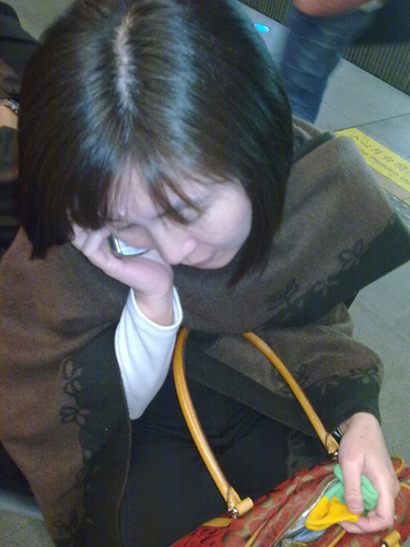 快車來了,上下的乘客很多,這母親等不及,所以擠向前去找她的孩子,但來往的眾人擋住了她嬌小的身軀,太低的目光,也讓她沒有什麼斬獲,索性拿起手機再打,"你到底在哪裡呀!" 這時她的孩子早已經刻意地繞過了她,然後在她的背後大聲地用手機回答,"你猜呀?",這母親轉過身去,想去抱他,這孩子馬上彈躲得老遠。他們在月台上追來追去,最後終於抓到了書包和袖子,那孩子還在一邊掙扎一邊說,"你白癡呀!",看來這一場鬧劇,是終於以和局收場。